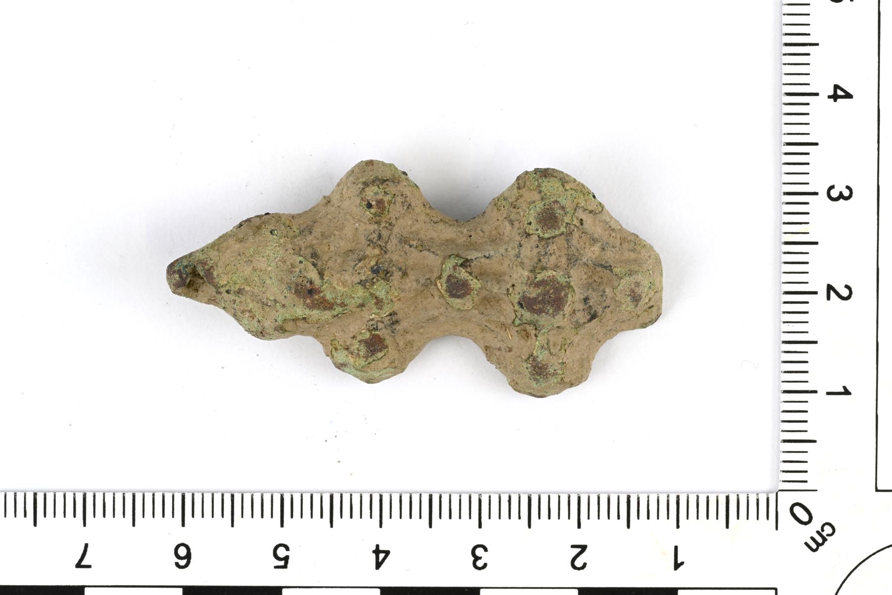 | Tasavartinen solki, jonka toinen pääty puuttuu. Pinta on melko kulunut, mutta siitä erottaa viivaornamentiikkaa sekä tappeja. Taustapuolella on säilynyt osa neulakodasta. Vrt. Kivikoski Fig. 12. | |