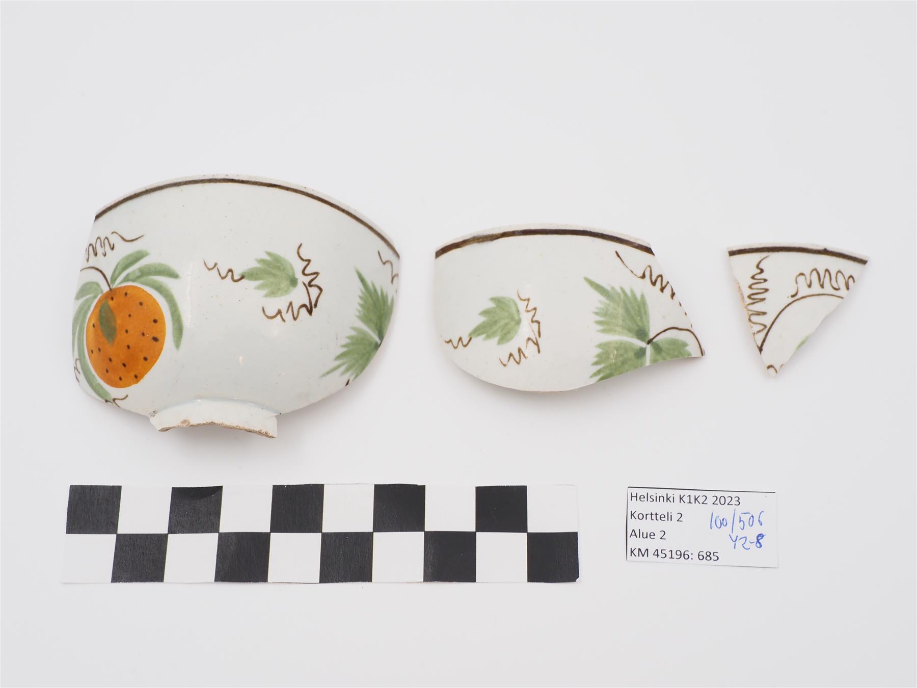 Kupin kylkikappaleita. Ulkopuolella appelsiini- ja lehtiaiheista koristelua. Ulko- ja sisäsuureunalla ruskeaa kupin kiertävää viivakoristelua. Samanlaista kuin :??? ja :646. | |