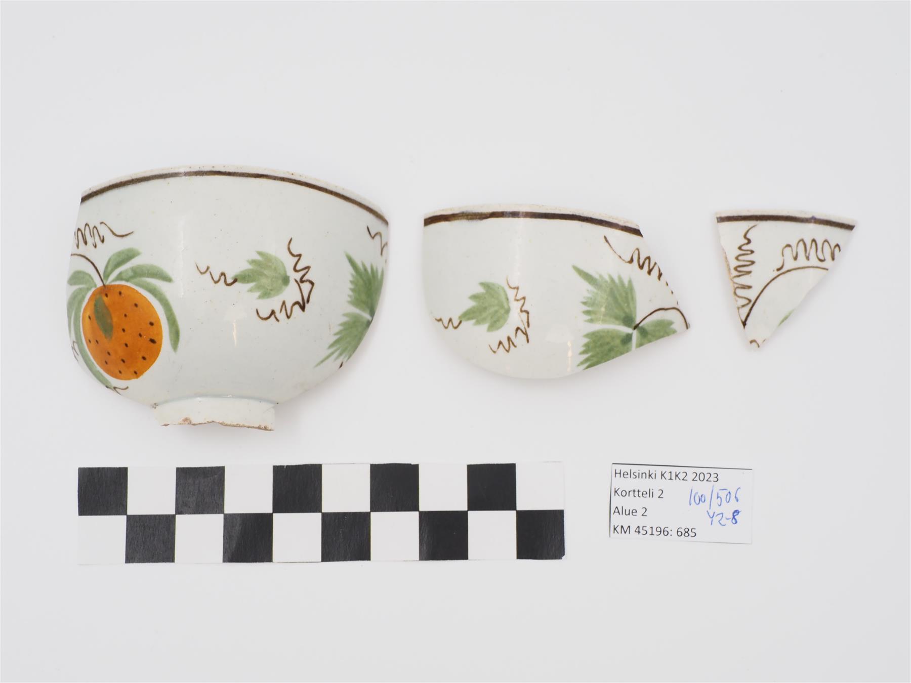| Kupin kylkikappaleita. Ulkopuolella appelsiini- ja lehtiaiheista koristelua. Ulko- ja sisäsuureunalla ruskeaa kupin kiertävää viivakoristelua. Samanlaista kuin :??? ja :646. | |
