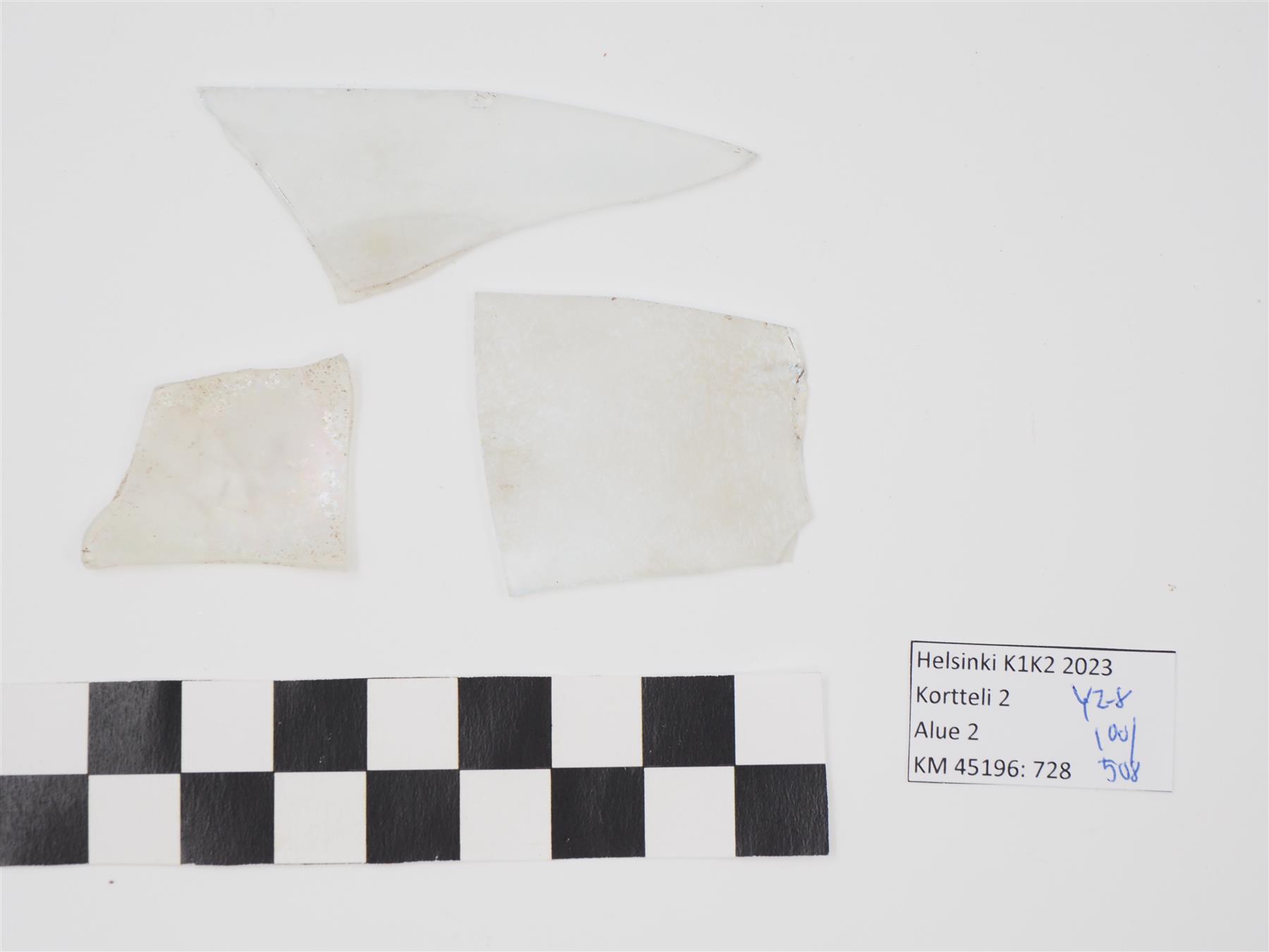 | 3 kpl värittömän lasiesineen palasia, pinta muuttunut valkoiseksi | |