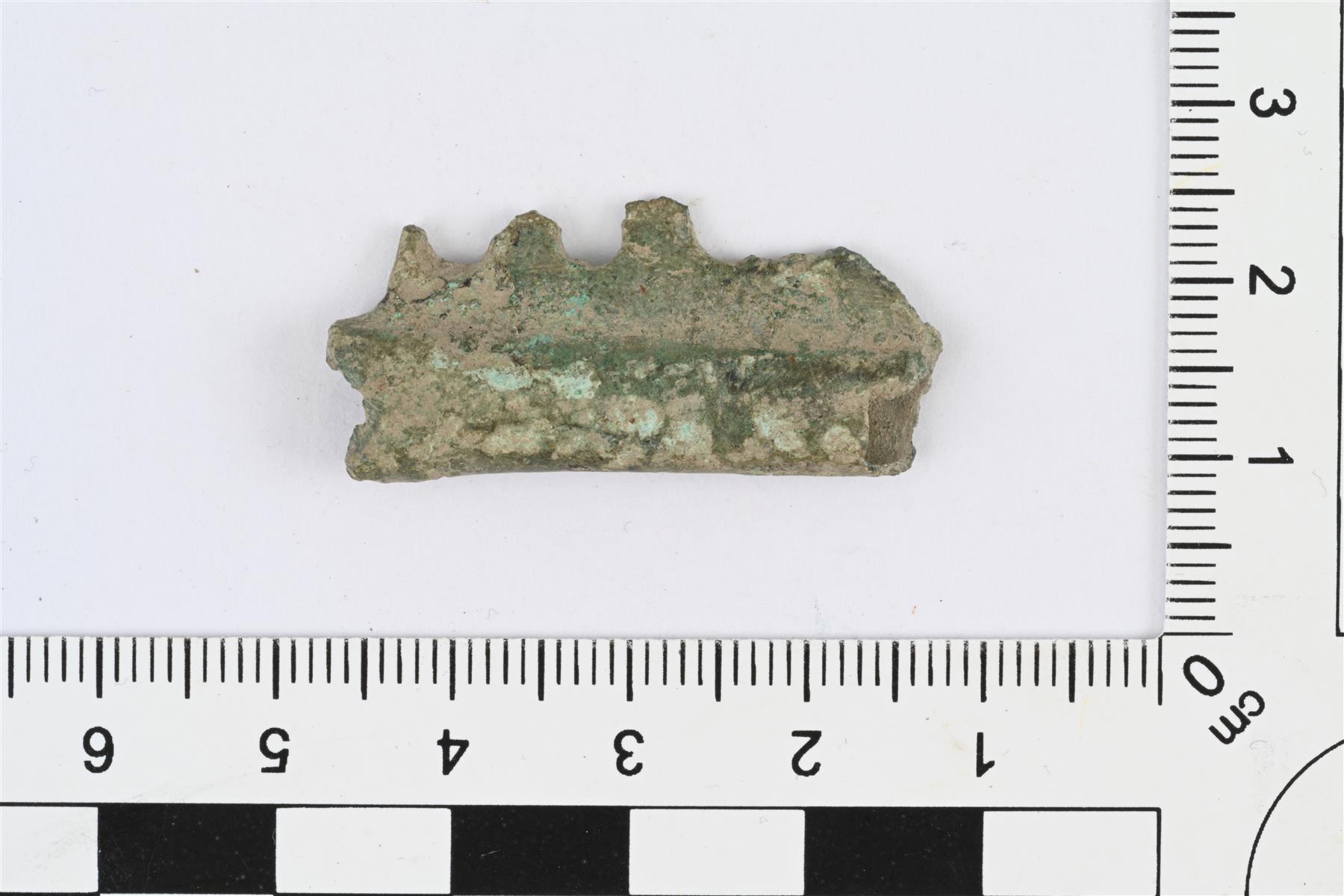 Neulakotariipuksen katkelma. Katkelma riipuksen putkimaisesta alaosasta. Toisesta pitkästä sivusta ulkonee yksinkertainen levymäinen puhkonainen osa, joka murtunut useiden reikien kohdalta. Vrt. Kivikoski 1973, Abb. 784. | |