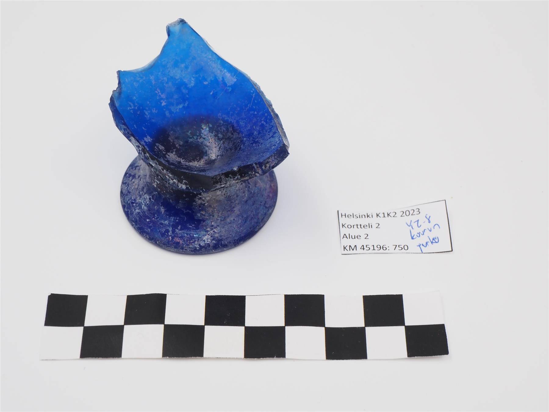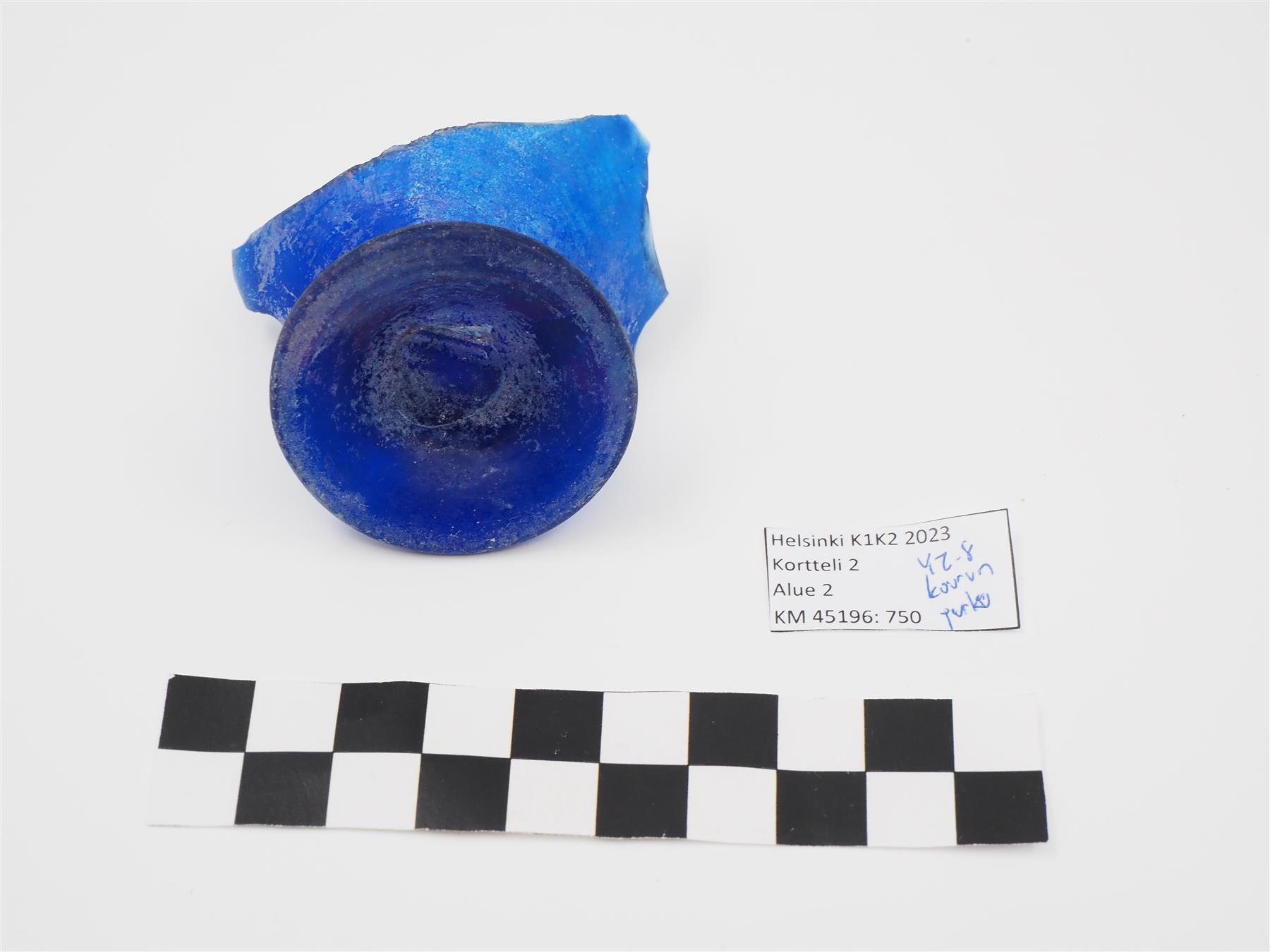| Tummansinisestä lasista valmistettu jalattoman lasipikarin jalkalevy sekä hieman kylkeä, pohjassa punttelin jälki. | |