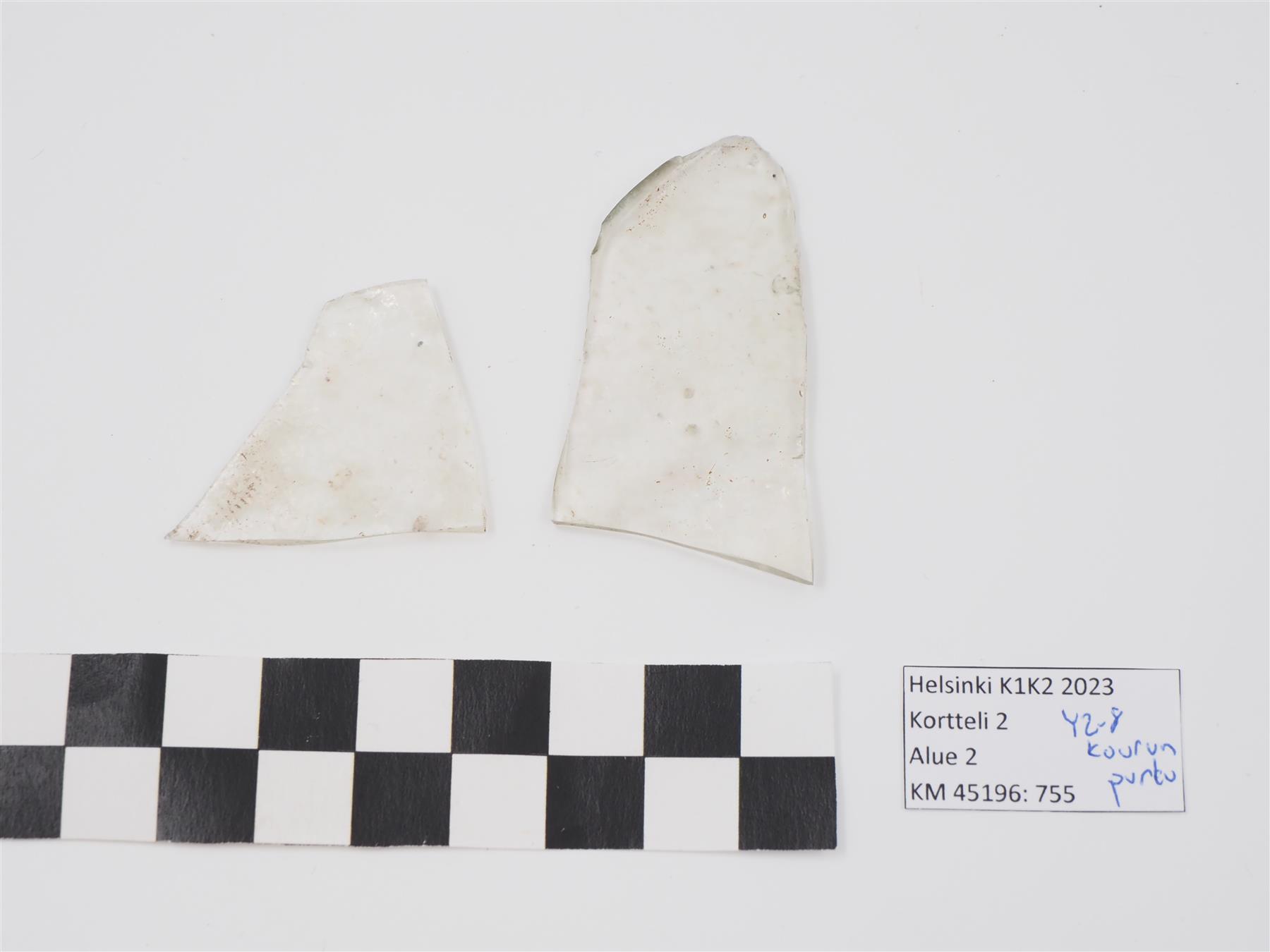 | Värittömän lasiesineen kylkipaloja, pinta aaltoileva | |