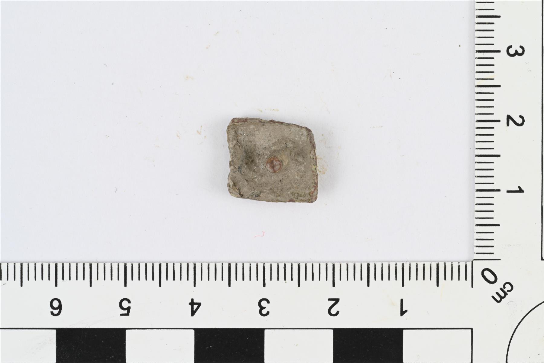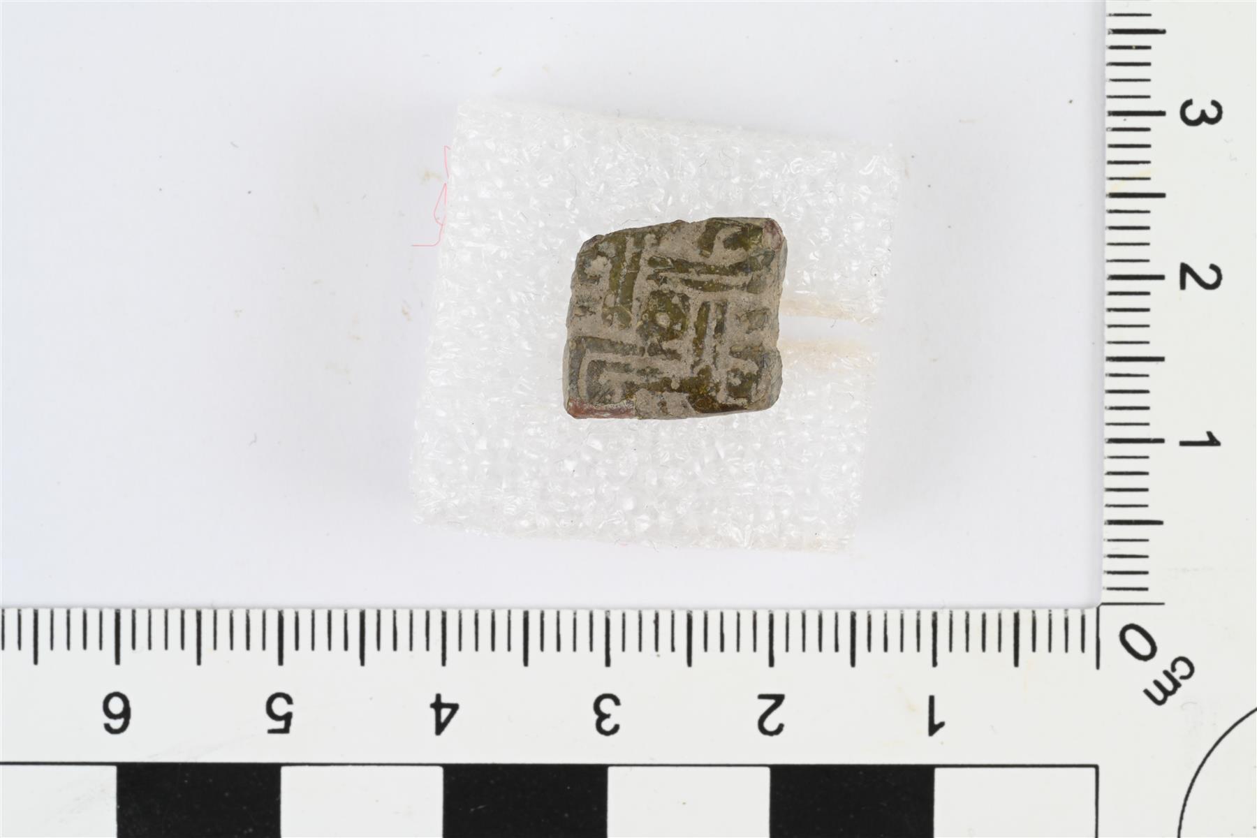 | Vinoneliön muotoinen vyön- tai hihnanhela. Etupuoli hieman kupera, taustapuoli kovera ja siinä niitti tai kiinnitystappi. Etupuolella kulmikkaana viivaornamentiikkana toteutettu hannunvaakuna. | |