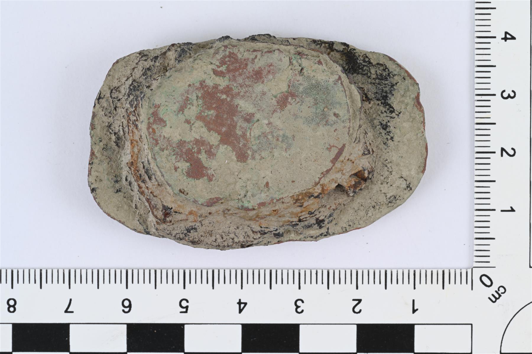 | Katkelma, jossa niitattu yhteen kupariseosta ja rautaa. Toisena pintana soikea kupariseoslevyn katkelma, jonka läpi lyöty kupariseoksinen niitti. Niitin kanta levyn puolella on soikeahko ja pienehkö, halkaisija 13-14 mm. Niitin toinen puoli on soikea ja suuri, halkaisija 30 x 36 mm. Kupariseoslevyn ja niitin kannan välissä rautaa noin 8 mm paksuudelta, joka koostuu mahdollisesti erillisistä levyistä. Samanlainen rakenne kuin katkelmassa KM 45723:6. | |