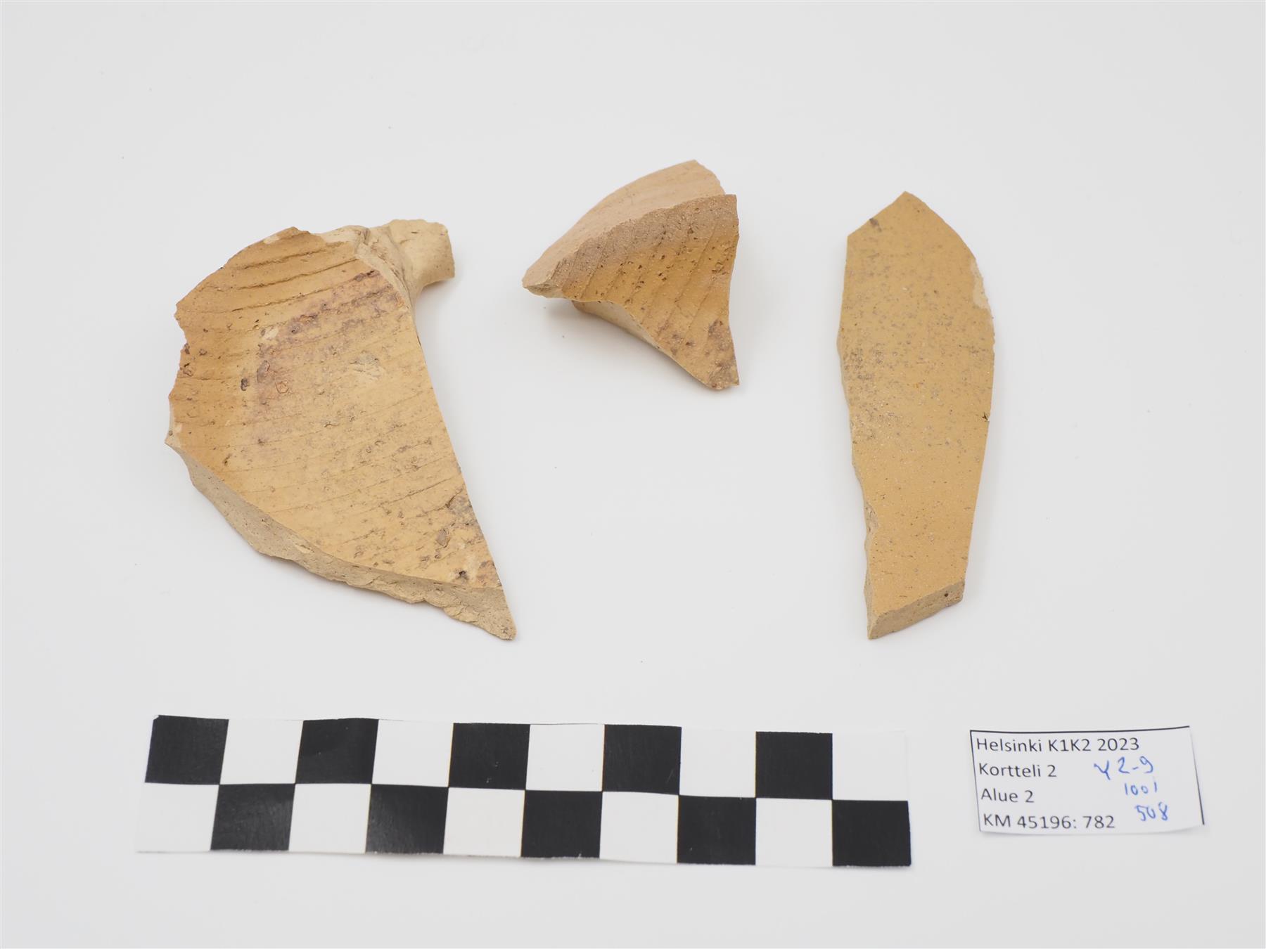 | Kivisaviastian kylkipala ja kaksi pohjapalaa samasta astiasta. Sisäpinta lasittamaton, ulkopinnalla väritön lasite. Sisäpinnalla ja -pohjassa dreijauksen jälkiä, ulkopohjassa rihlausta. | |