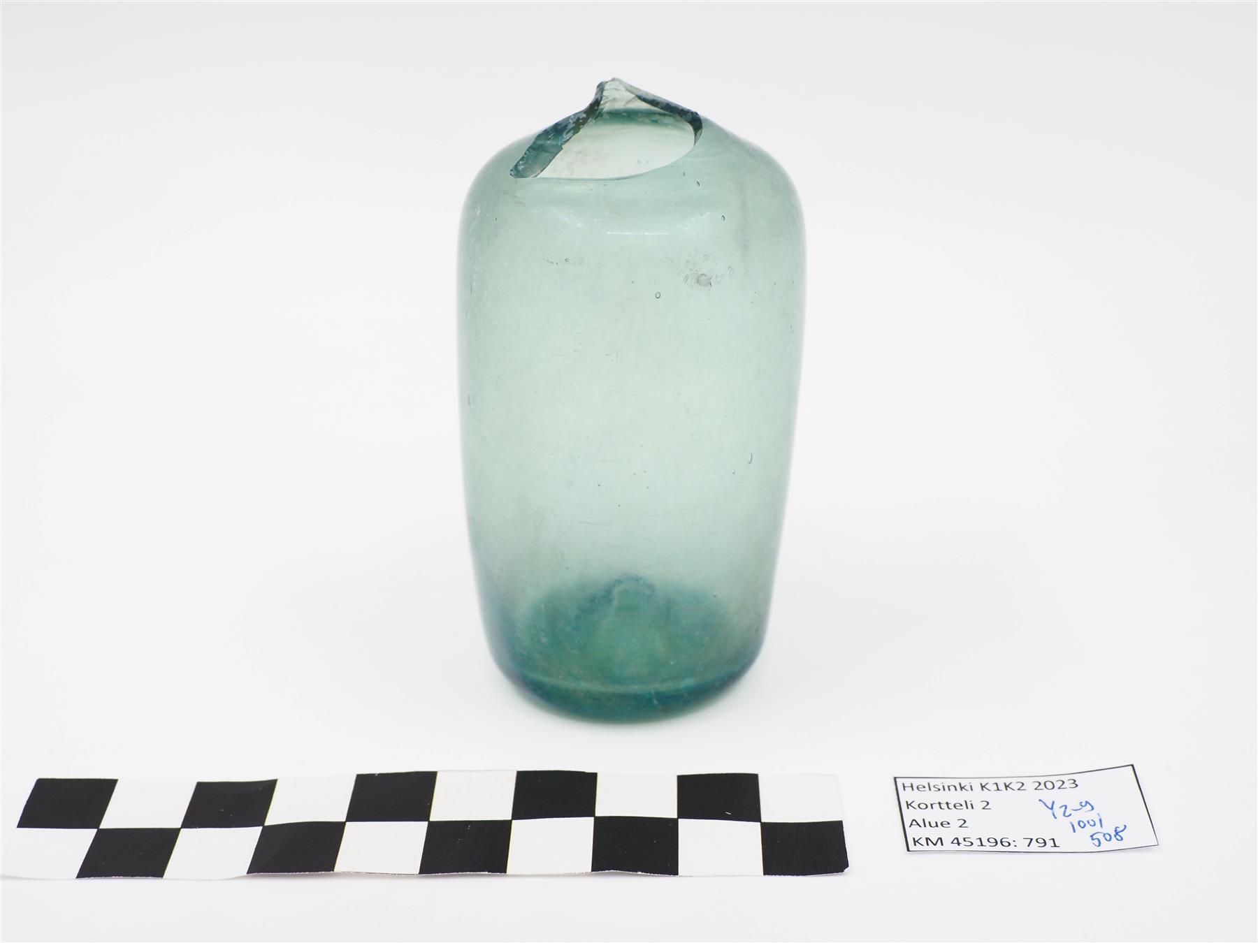 | Lähes kokonainen pienikokoinen vihreästä lasista valmistettu lasipullo, ainoastaan kaula irronnut. | |