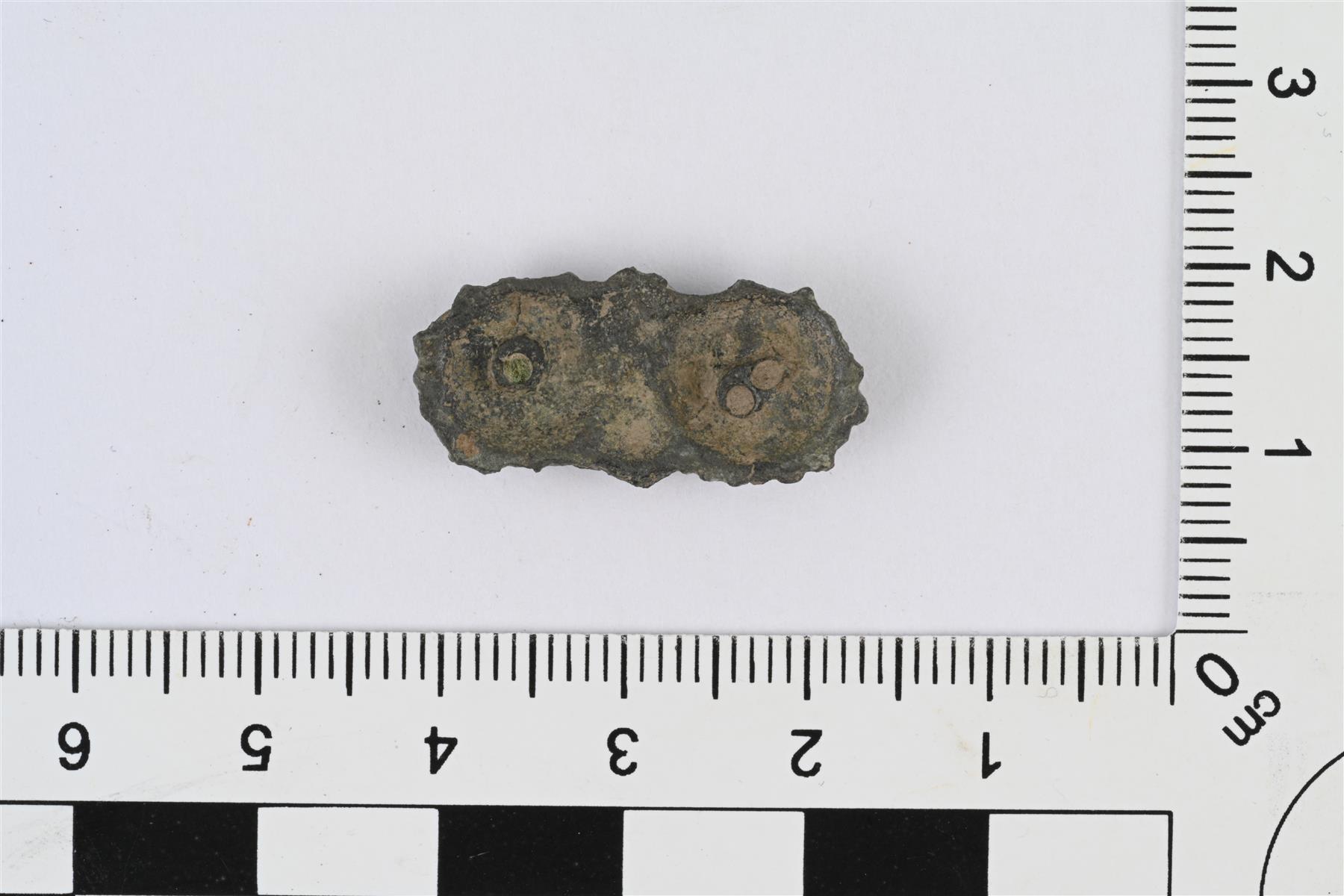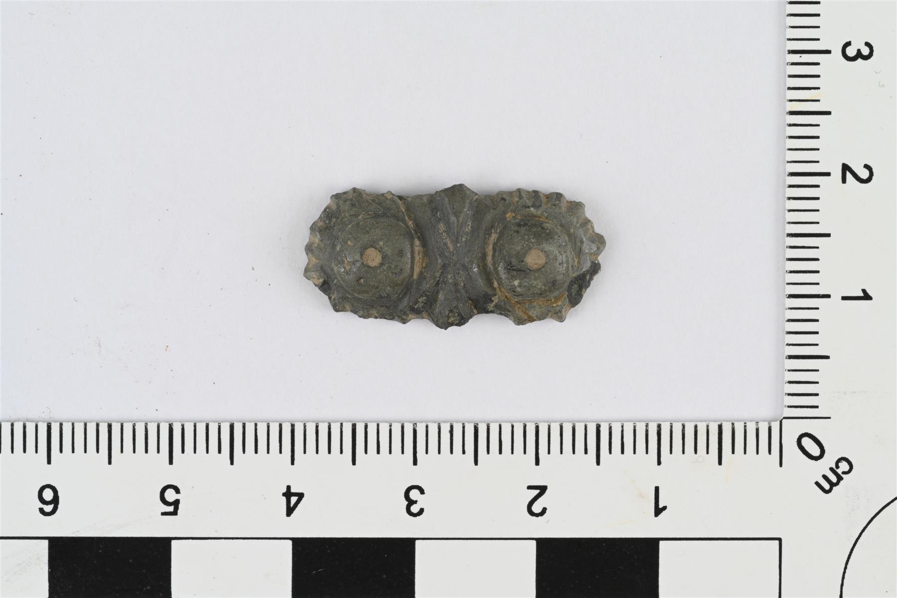 | Pitkänomainen vyönhela. Päissä ympyrät, joiden reunat sahalaitaiset. Taustapuolella ympyröiden kohdalla niitit. Samanlainen kuin Kivikoski 1973, Abb. 928. | |