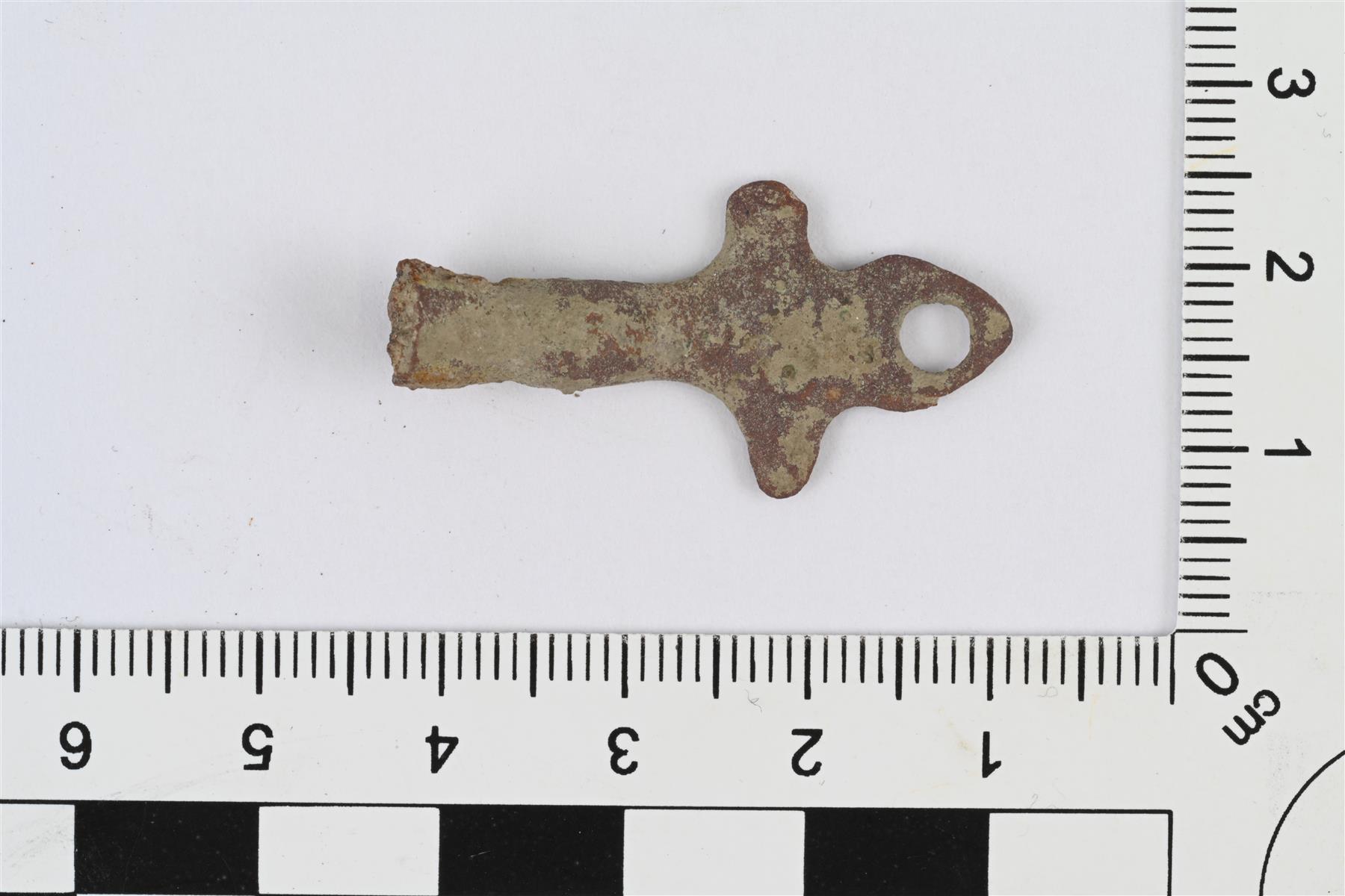 | Kupariseosesineen katkelma. Pitkänomainen katkelma, jonka toisessa päässä on katkennut profiloitu varsi. Toinen pää on ehjä, levenevä ja litistyvä, ja siinä on sivuille ulkonevat lyhyet pyöristetyt sakarat ja aivan päässä varren jatkona litteä kolmiomainen lenkki. Litteässä osassa sakaroiden välissä kaksi häränsilmäleimaa. | |