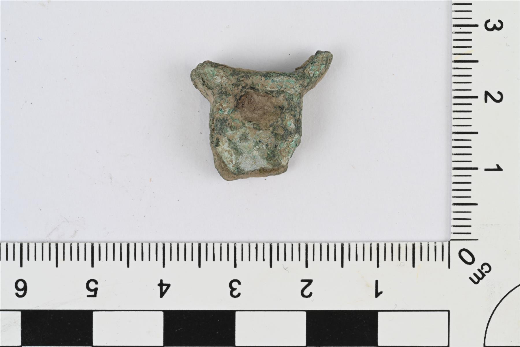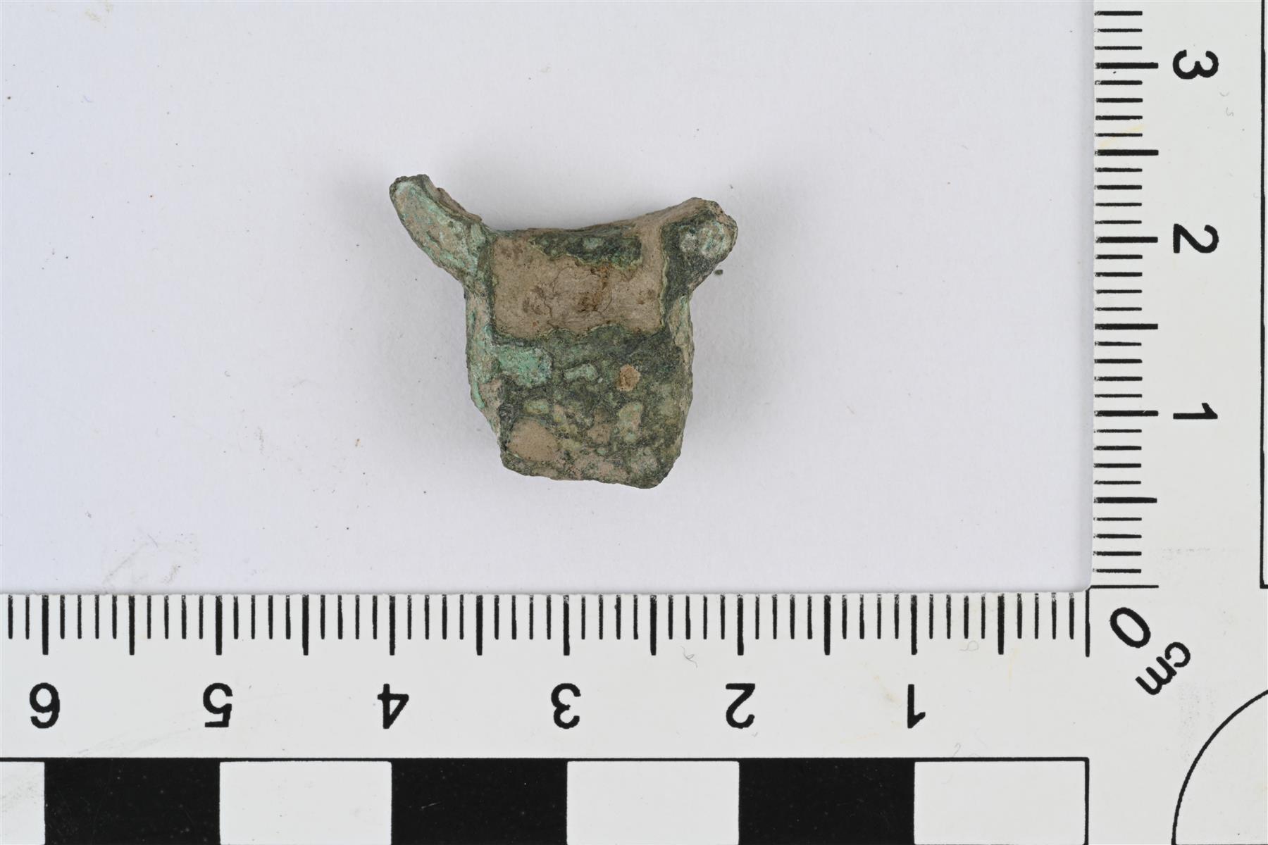 | Kupariseosesineen katkelma. Suorakulmion muotoinen, litteähkö ja paksuhko, toisessa päässä poikittainen lovi, toisessa päässä sivuille haarautuvat kaarevat vartaat. | |