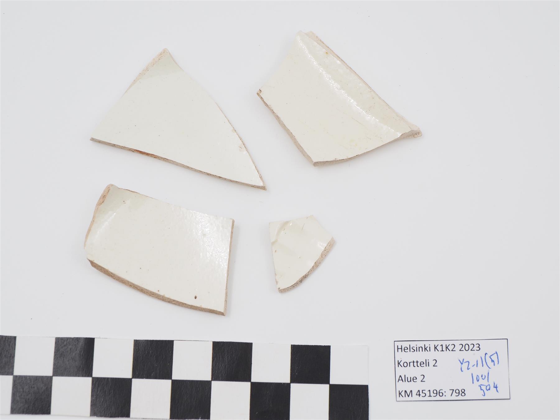4 kpl piiposliinisen astian kappaleita, valkoinen tinalasite molemmilla puolilla | |