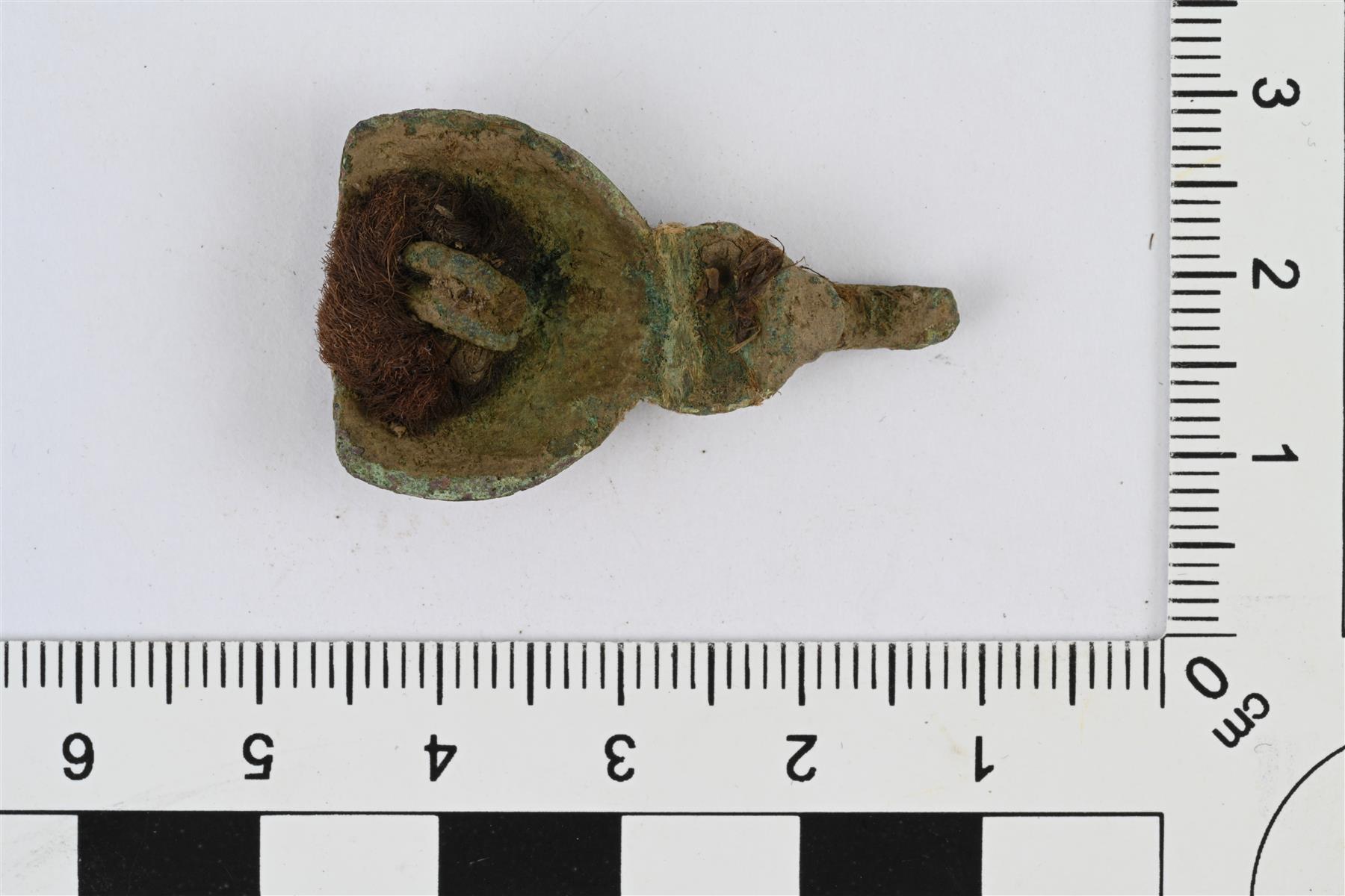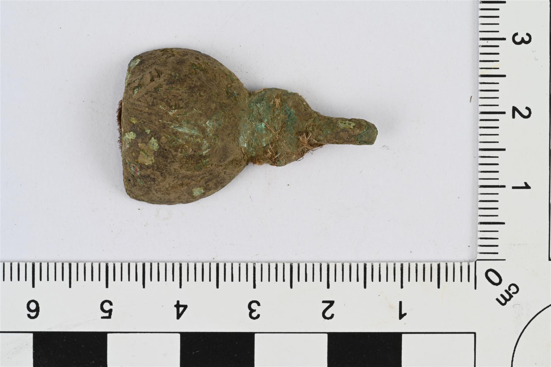 | Vaatteen hakanen. Toisen pään muodostaa pyöreä kupera osa, jonka reuna on murtunut. Sen jatkona on pienempi pyöreä kupera osa, jonka jatkona on katkennut koukku. Isoimman pyöreän osan taustapuolella on kahdesta limittäin taivutetusta vartaasta muodostuva kiinnityssilmukka, jossa on kiinni tekstiiliä. Etupuolella mahdollisesti reliefikoristelua. | |