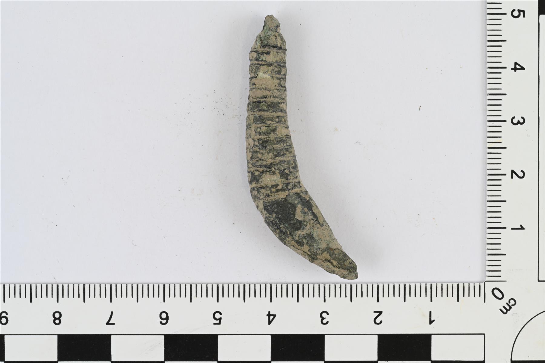 | Karhunhammasriipus. Muodoltaan paksu ja loivasti kaartuva. Yläpäästä katkennut ripustuslenkki. | |