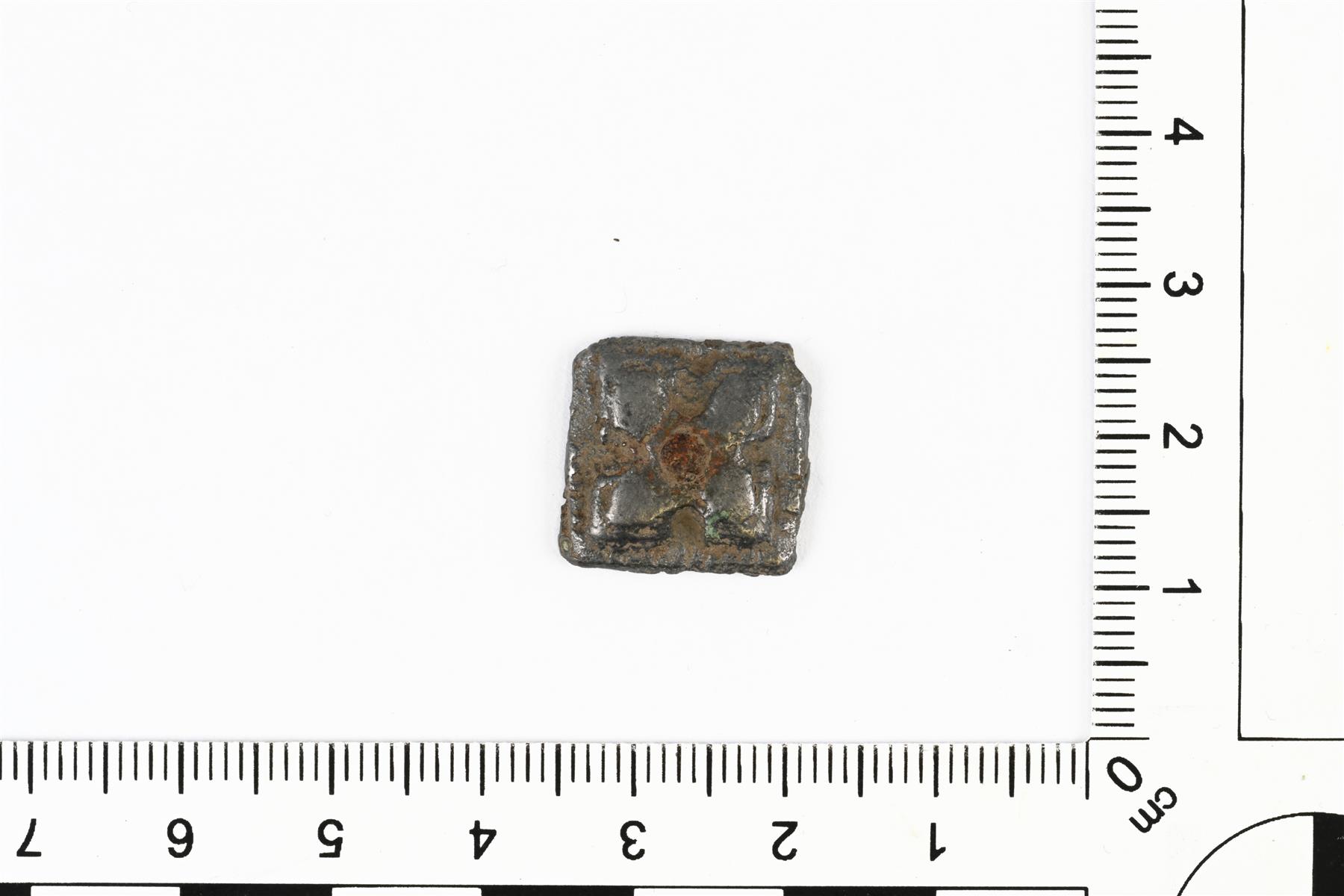 | Neliönmuotoinen ruusukehela. Keskellä on kohokuviona toteutettu vinoristi ja reunoja kiertää poikittaisten viivauurteiden muodostama kenttä. Keskiosassa on niittiä varten reikä ja rautaisesta niitistä on säilyneenä palanen. | |