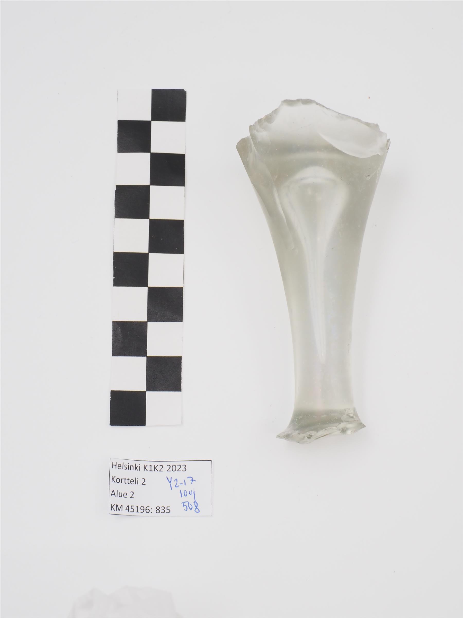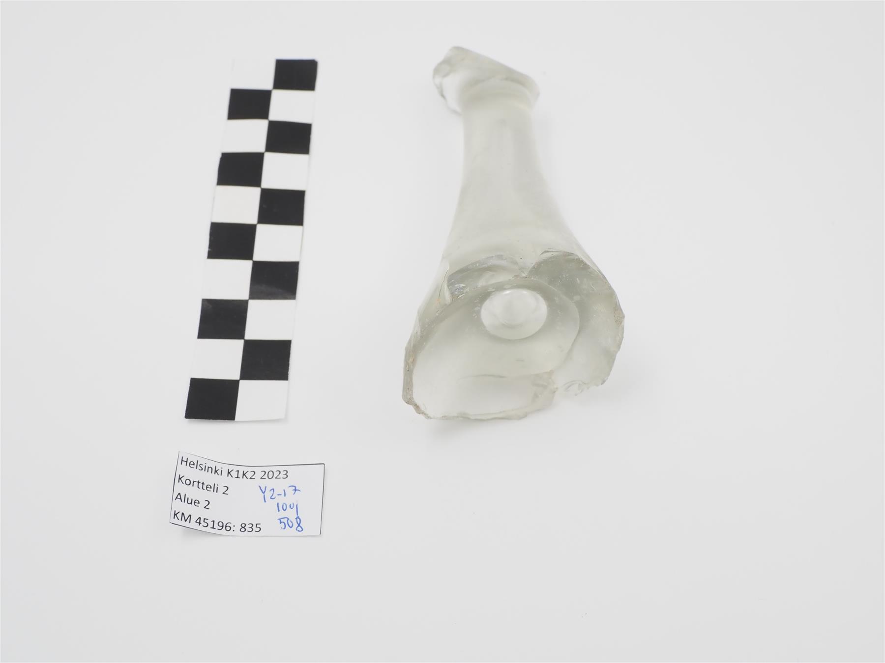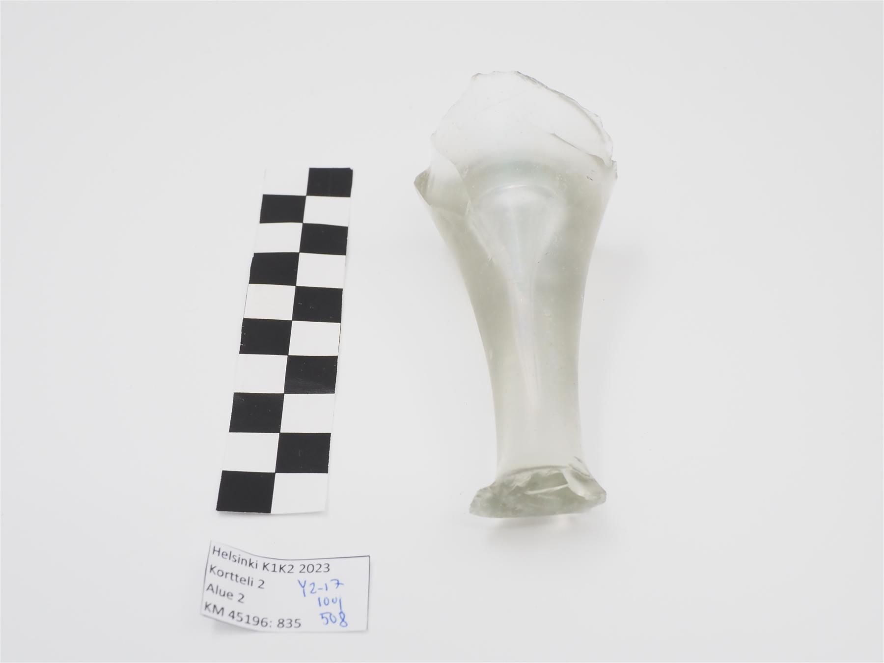 | Suurikokoisen lasipikarin jalka, väritöntä lasia. Lasin sisällä suurikokoinen ilmakupla. | |