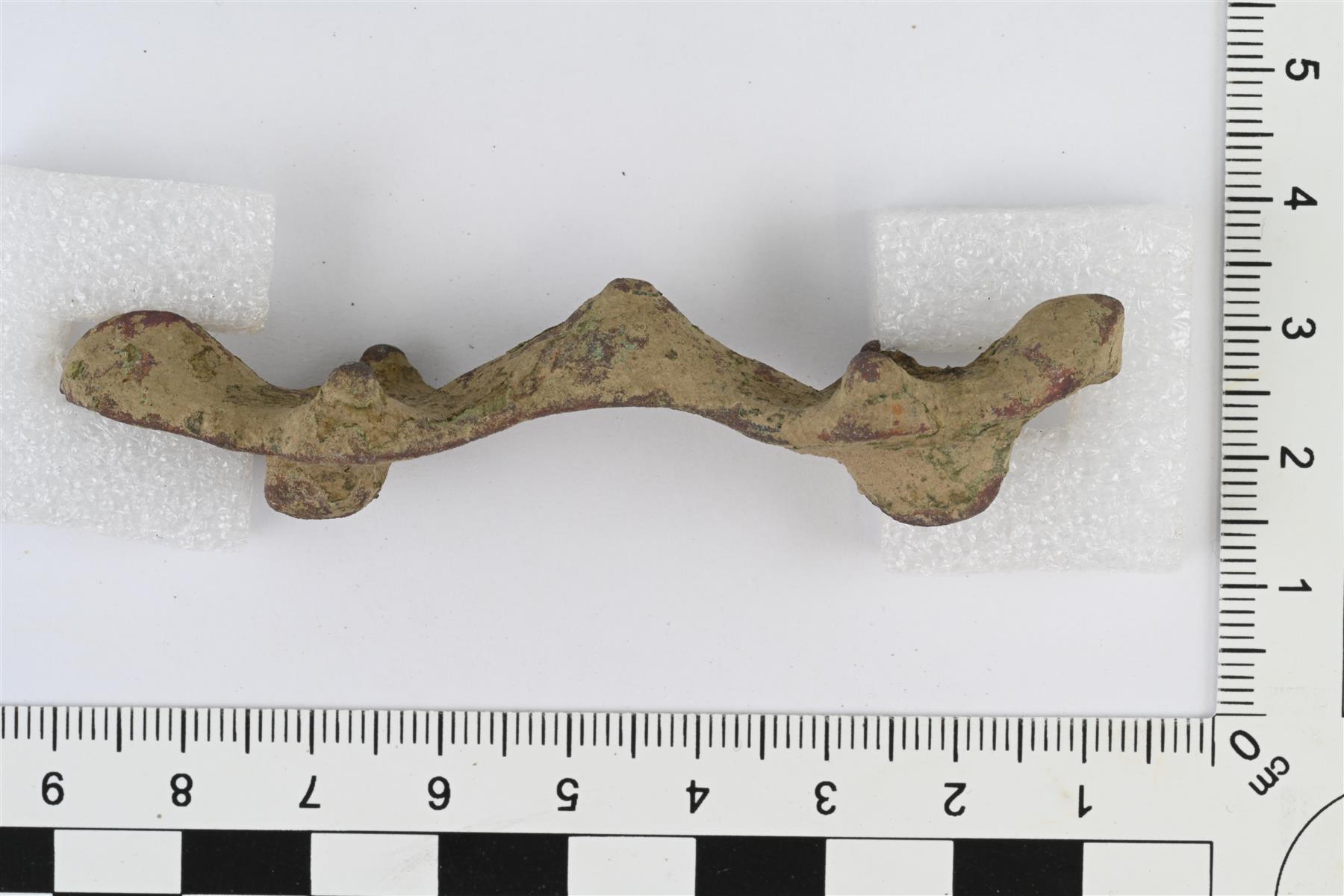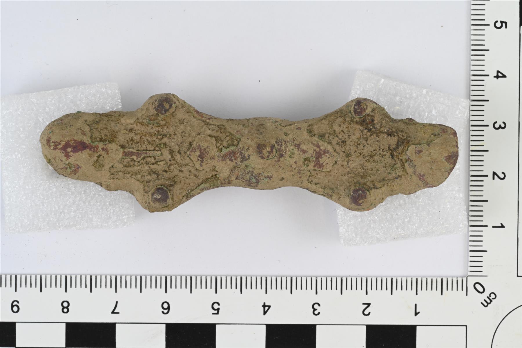 | Tasavartinen solki. Neula puuttuu, muuten ehjä. Vastaa Kivikosken ryhmää 8 (1938, s. 25-26, Fig. 21-22). Muodoltaan kapea, solakka ja pehmeälinjainen. Etupuolella matalaa tappikoristelua ja viivakoristelun jäänteitä. Toinen pää lytistynyt, luultavasti osittain sulanut. | |