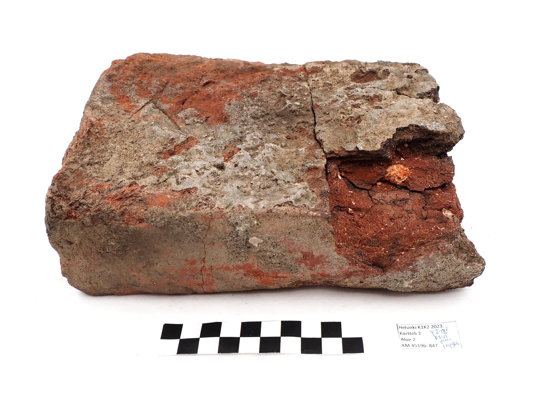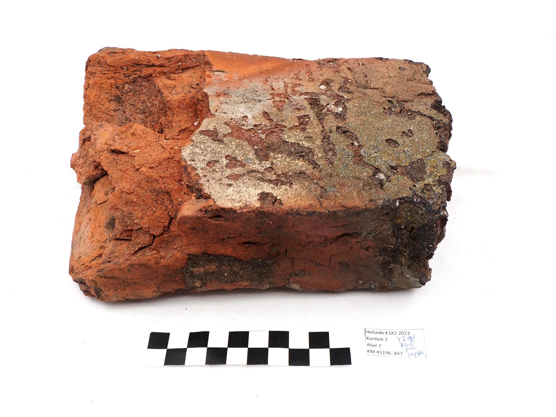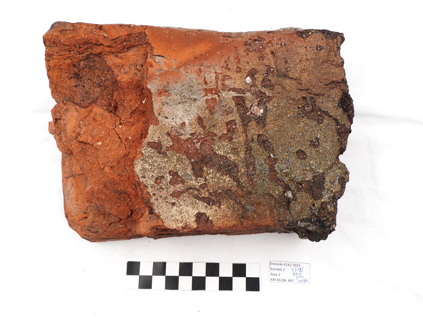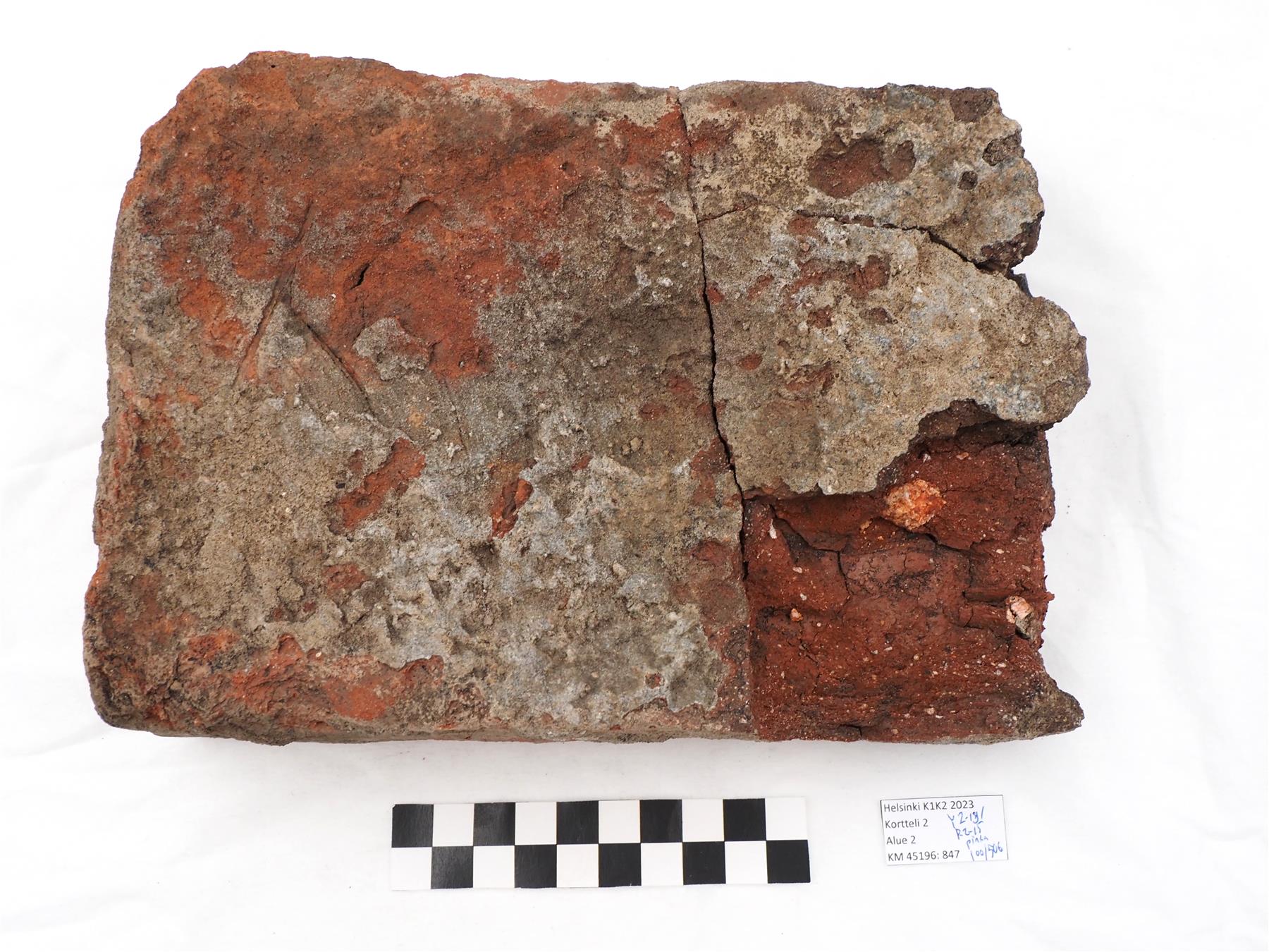 | Suurikokoisen punasavisen käsintehdyn tiilen kappale. Pinnalla jäämiä laastista, osassa pinnasta nähtävissä nokeentumisen jälkiä. | |