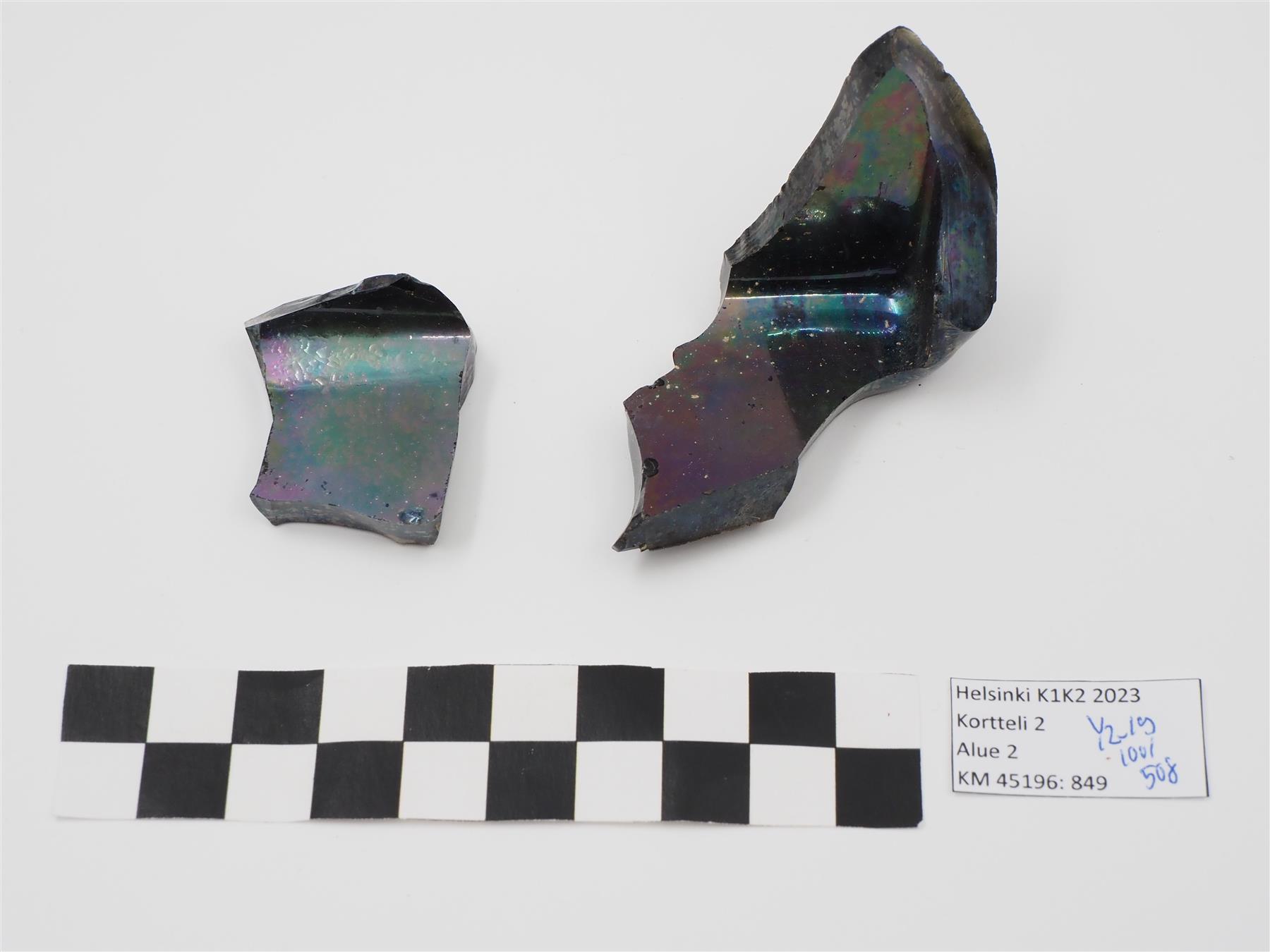 | Tumman kulmikkaan lasipullon pohjapaloja, pinta iridisoitunut | |