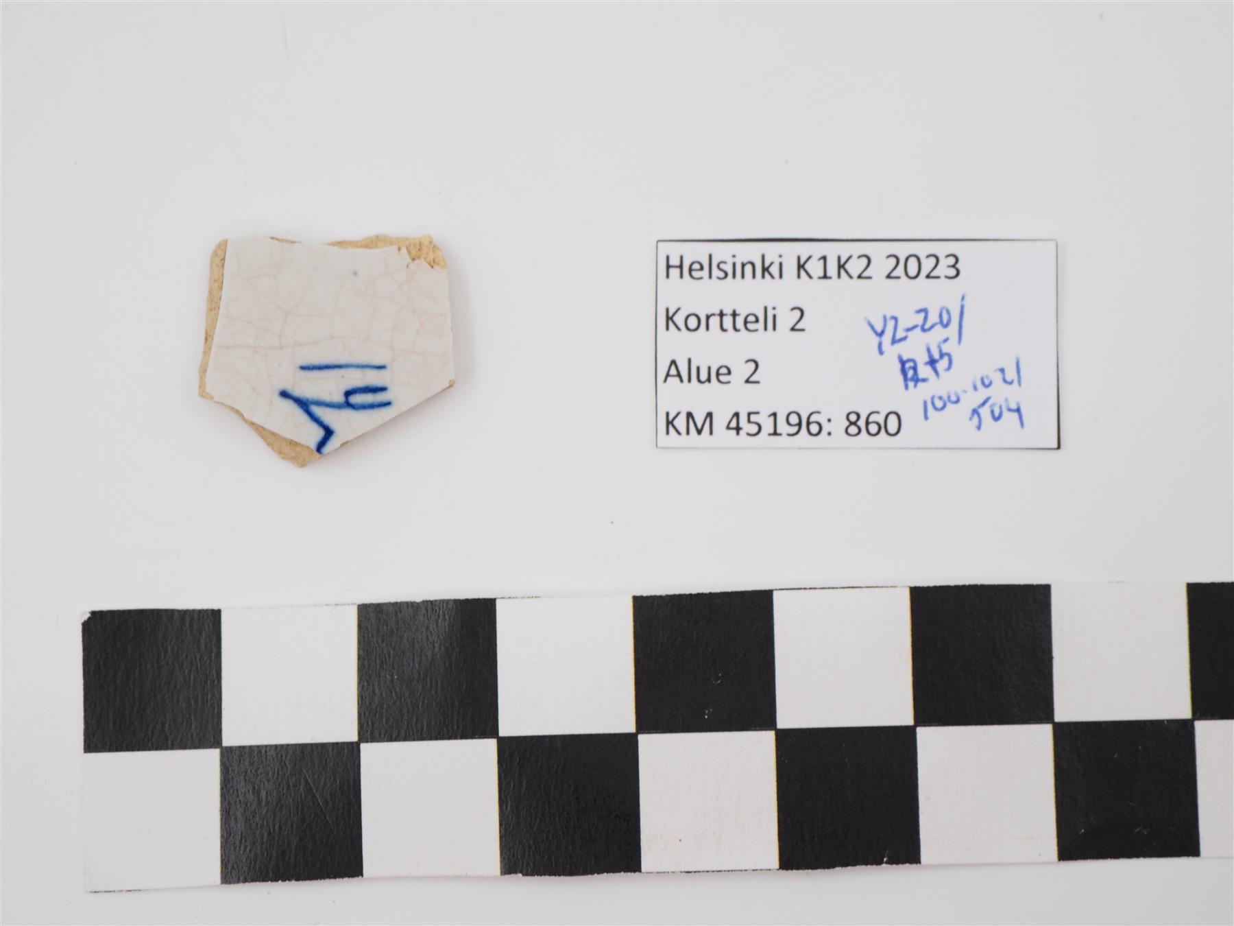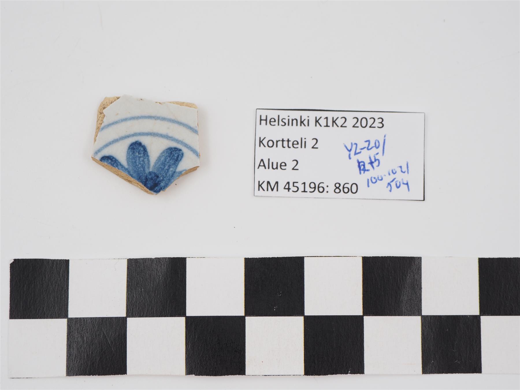 | Pieni tasainen fajanssiastian tai -kaakelin palanen. Molemmilla pinnoilla valkoinen tinalasite. Toisella puolella sinistä kukka- ja kehäkuviointia, toisella puolella sinisiä viivoja. | |
