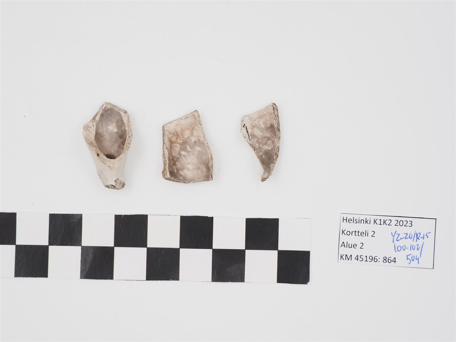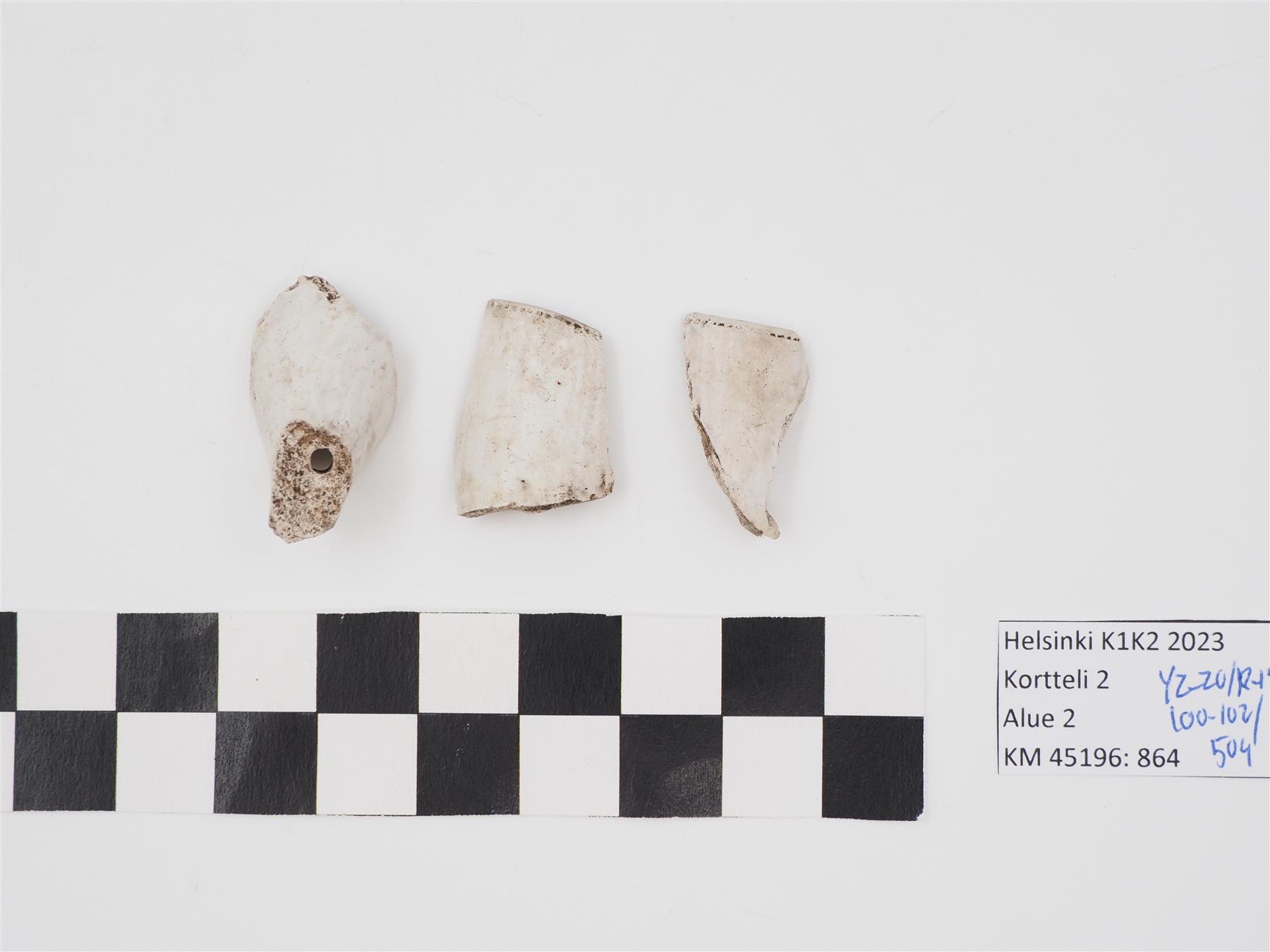 | Liitupiipun pesän kanta ja kaksi suureunan palaa. Suureunalla yksi rivi pisteviivakoristelua. | |