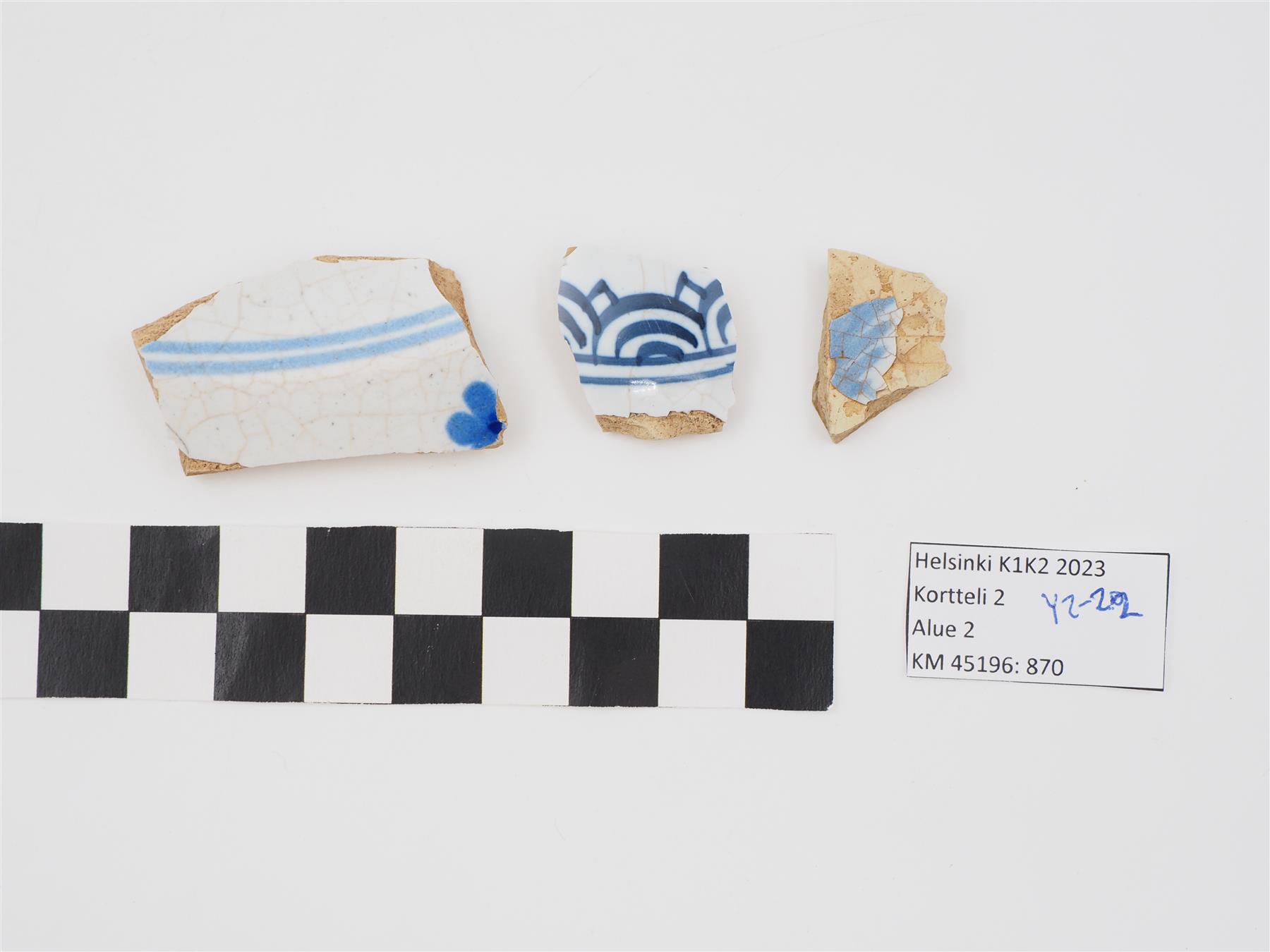 | 3 kpl fajanssiastioiden paloja, molemminpuolinen valkoinen tinalasite, jossa sinistä käsinmaalattua kuviointia | |