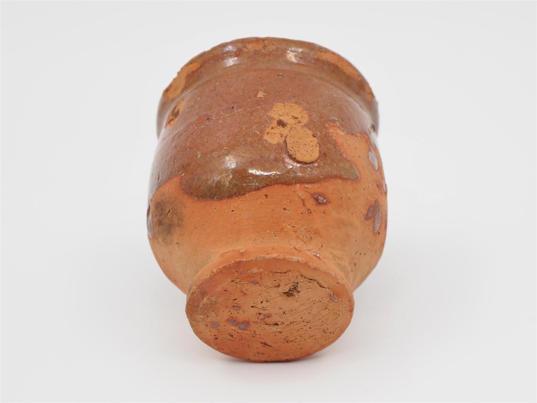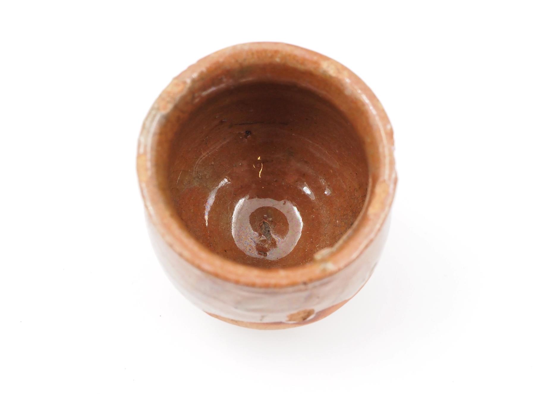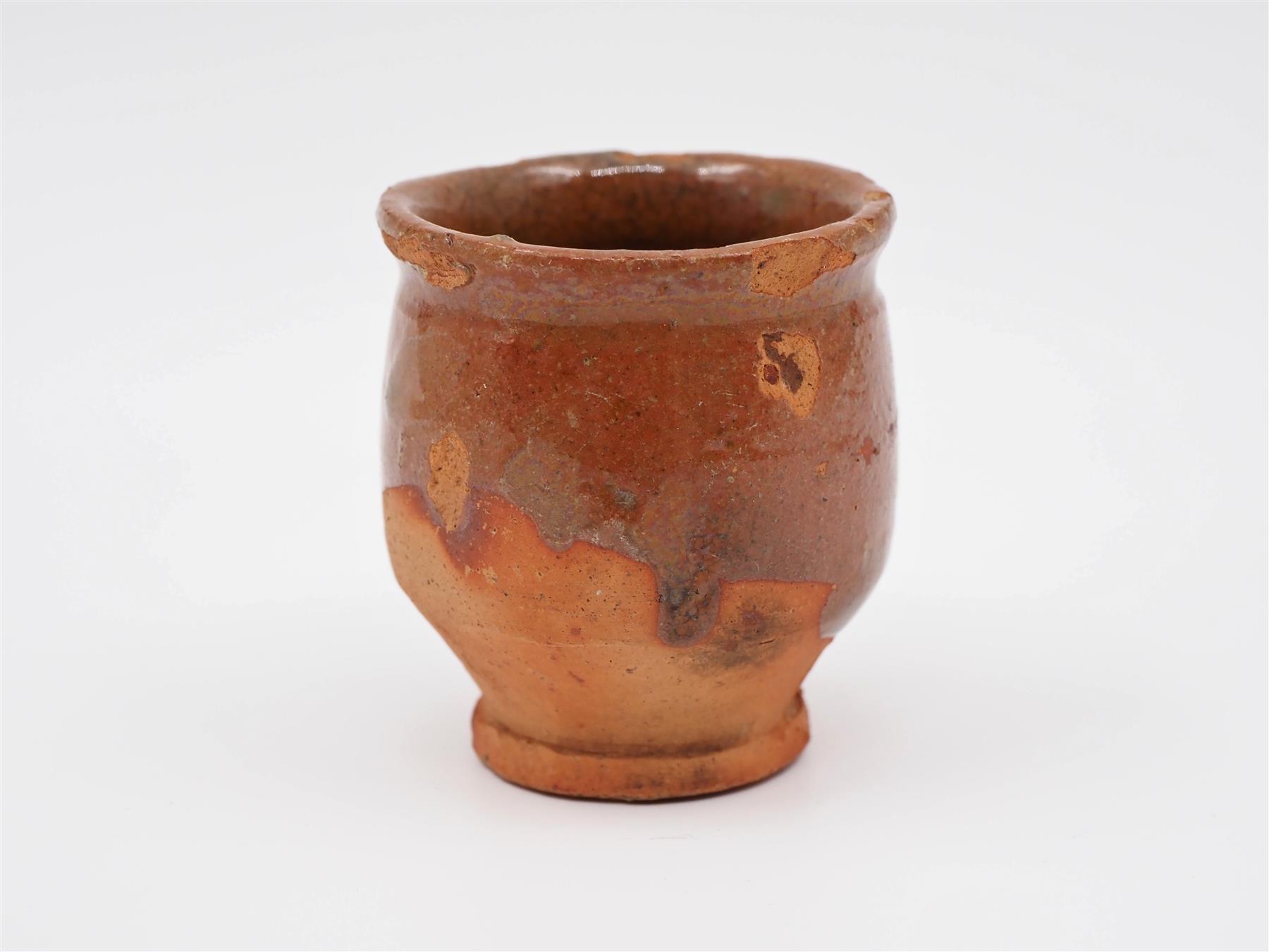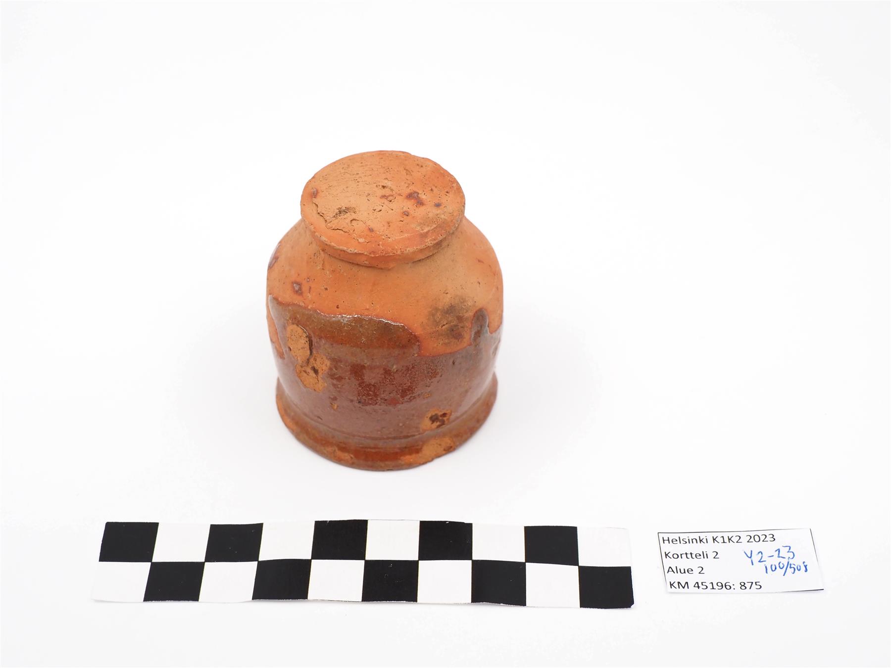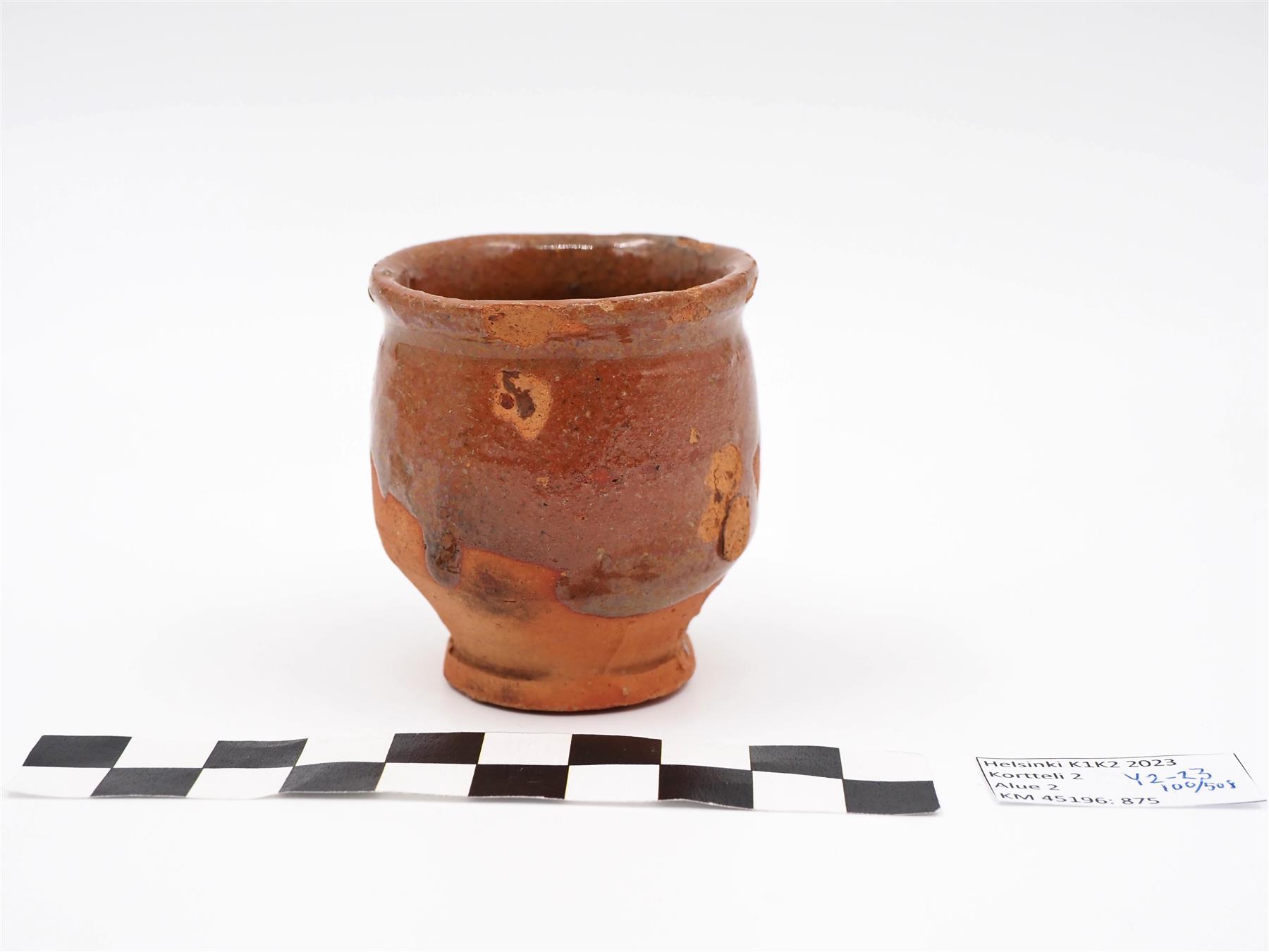 | Kokonainen ehjä punasavinen kuppi. Hyväkuntoinen, lasite irronnut hieman suureunasta. Sisäpinnalla ruskea lyijylasite, joka jatkuu ulkopinnan kyljen keskiosaan. Alapinta lasittamaton. Pyöreä jalkalevy. | |