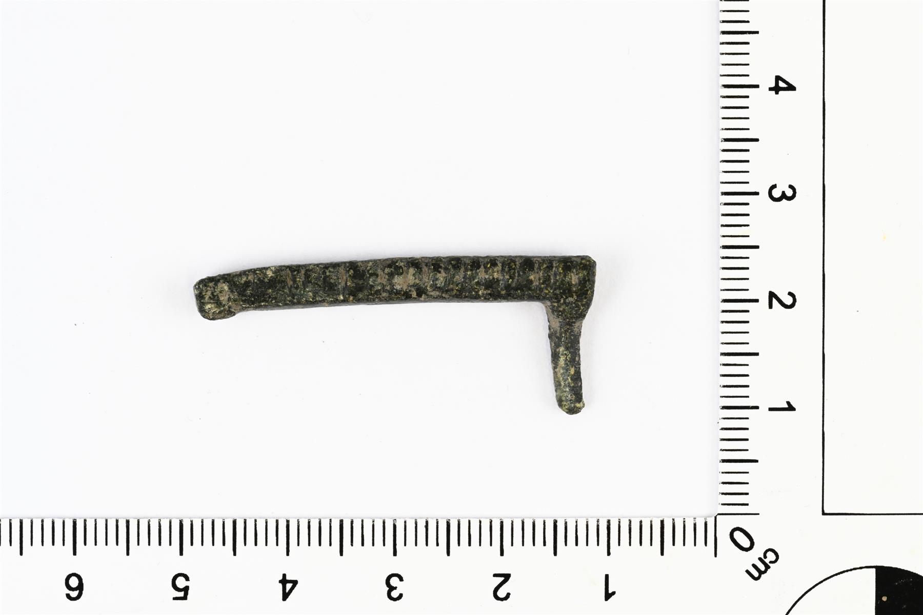 | Mahdollinen kehän katkelma neliönmuotoisesta vyönsoljesta. Koristeluna poikittaisia viivauurteita. | |
