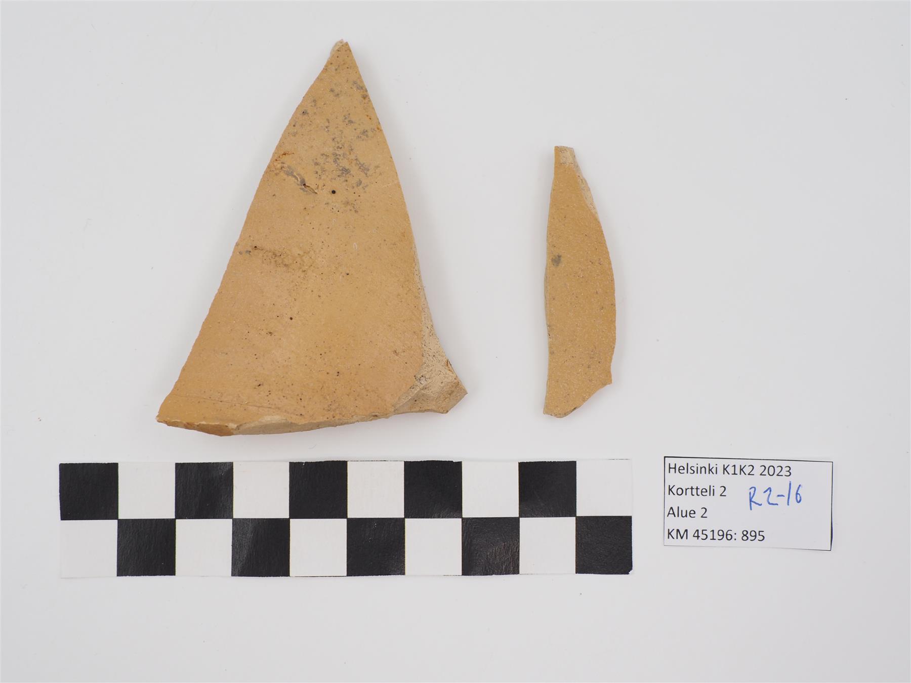 | 2 kpl kivisaviastian kylkipaloja. Ulkopinnalla väritön lasite, sisäpinta lasittamaton. | |