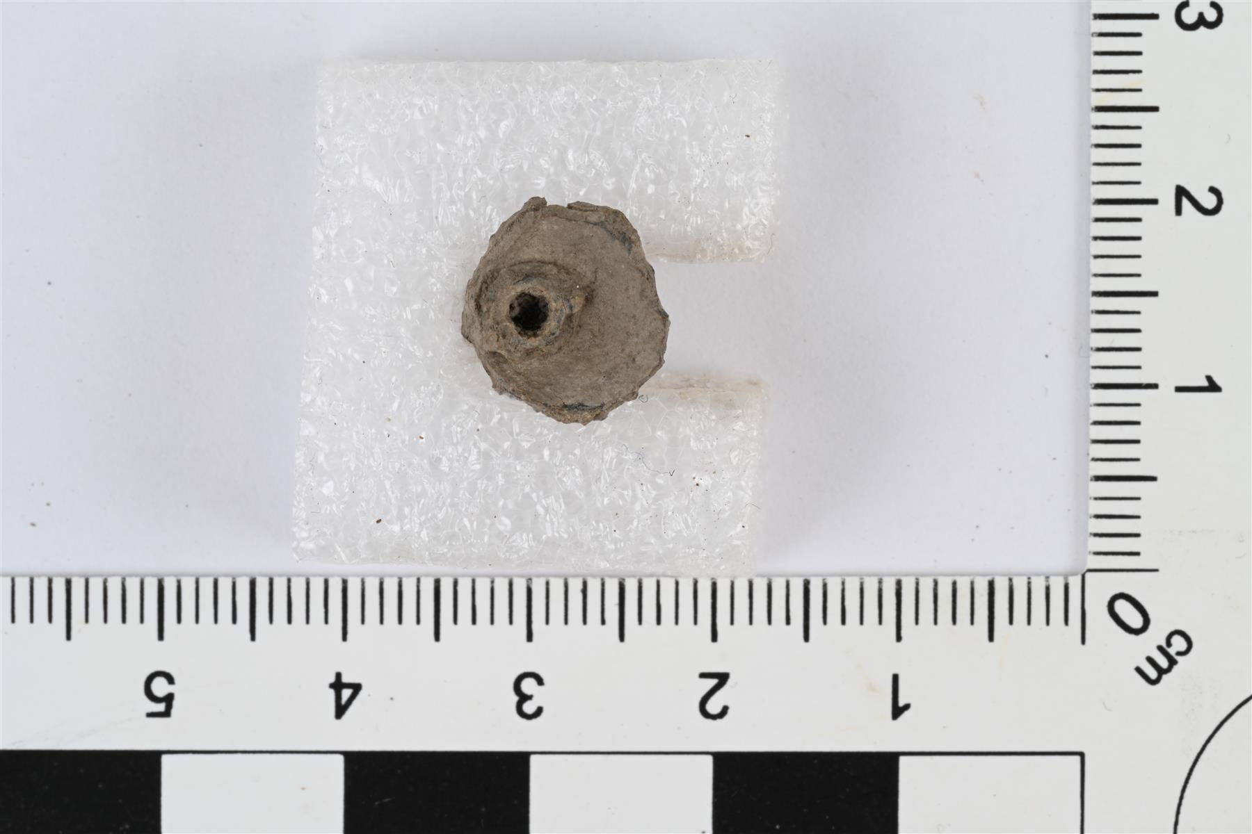 | Pieni tinaseoksinen vyönhela, jonka reunat lohkeilleet pois. Keskellä nuppi. Taustapuolella kiinnitystappi. | |