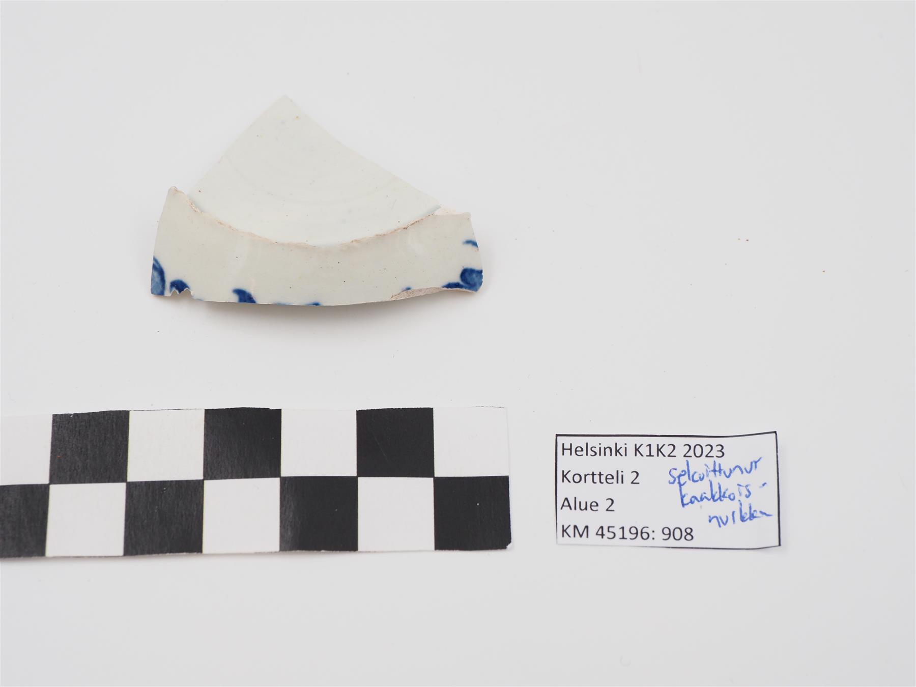 | Kupin pohjapala. Valkoinen tinalasite, molemmilla pinnoilla käsinmaalattua sinistä kasviaiheista koristelua. | |