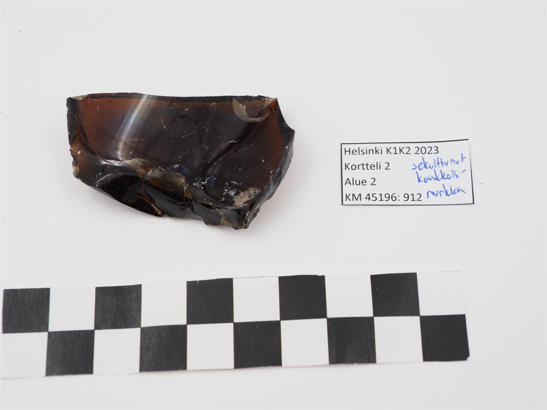 Löytöyhteys: | Kaivausalueen kaakkoisnurkassa olleesta epäselvästä sekoittuneesta kerroksesta, jossa modernia purkujätettä |