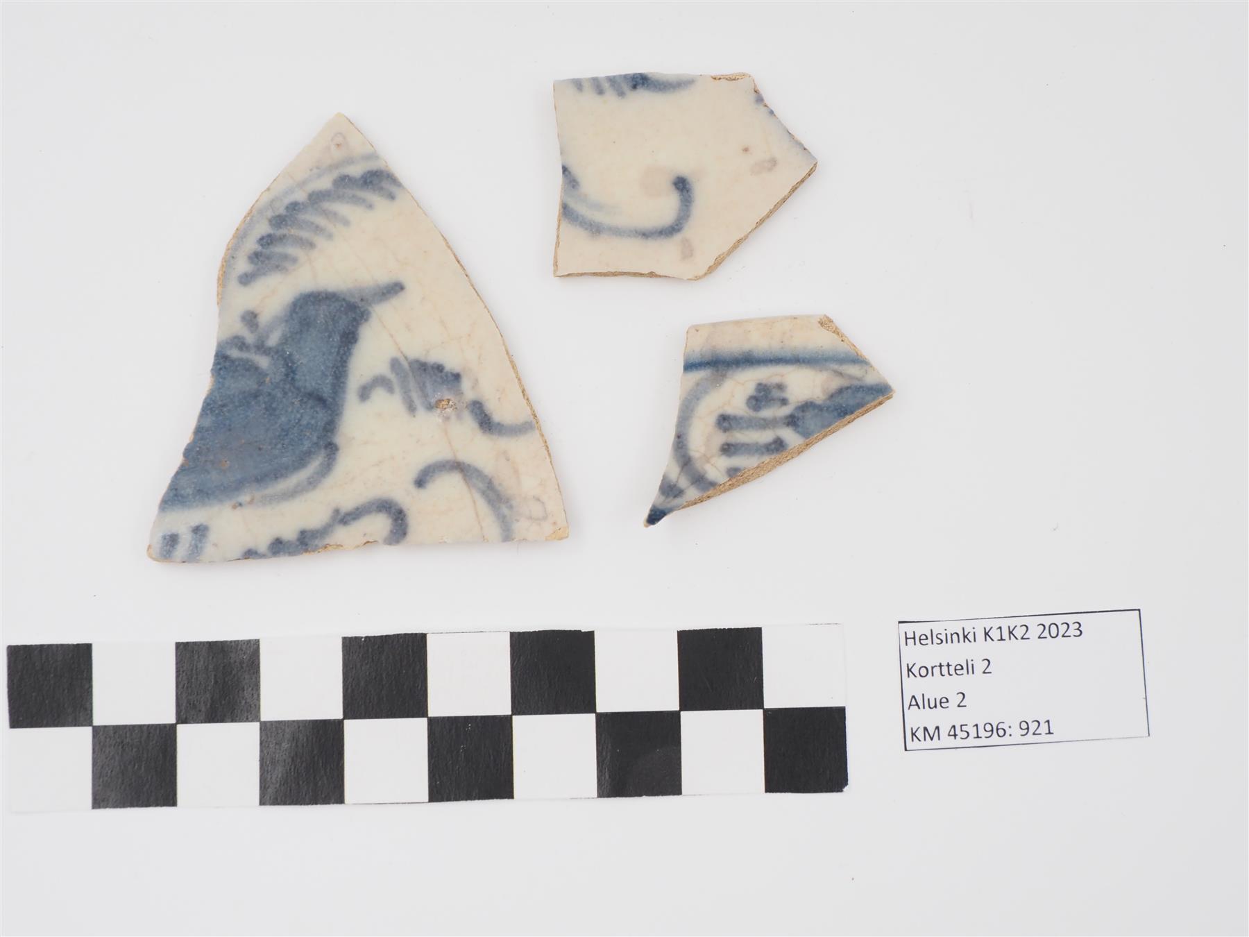 Fajanssilautasen tai kaakelin paloja. Molemmilla pinnoilla tummunut valkoinen tinalasite, jossa käsinmaalattua sinistä koristelua. | |