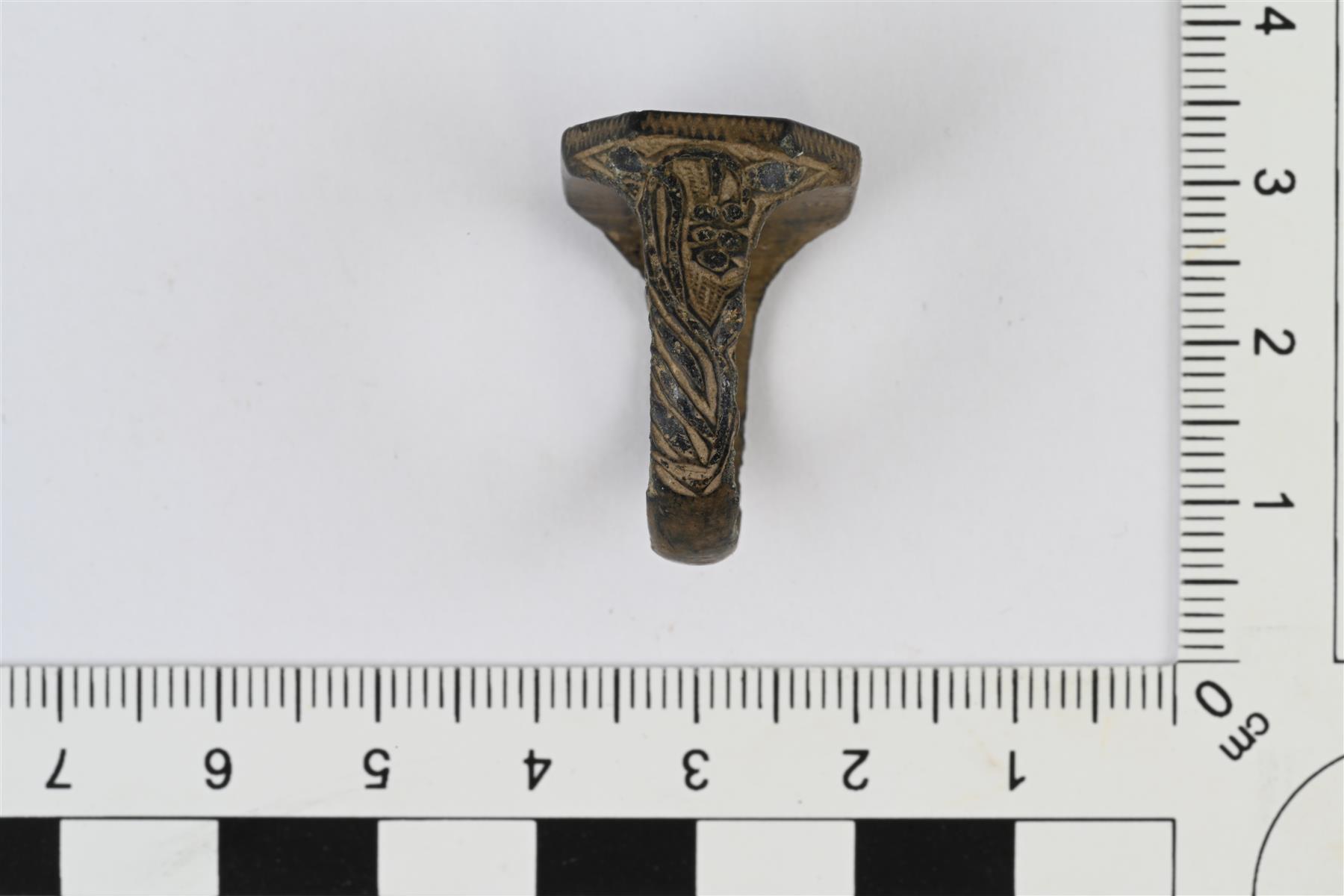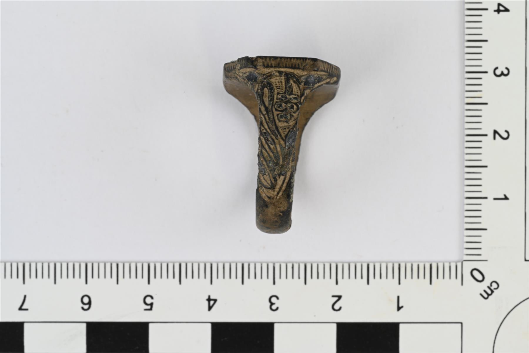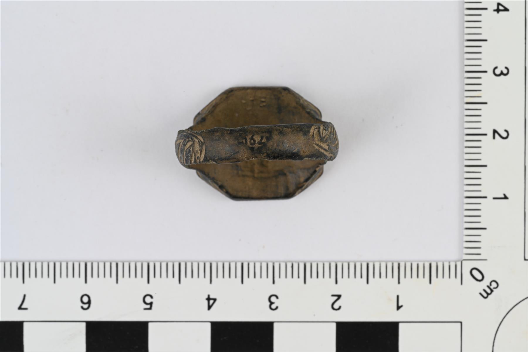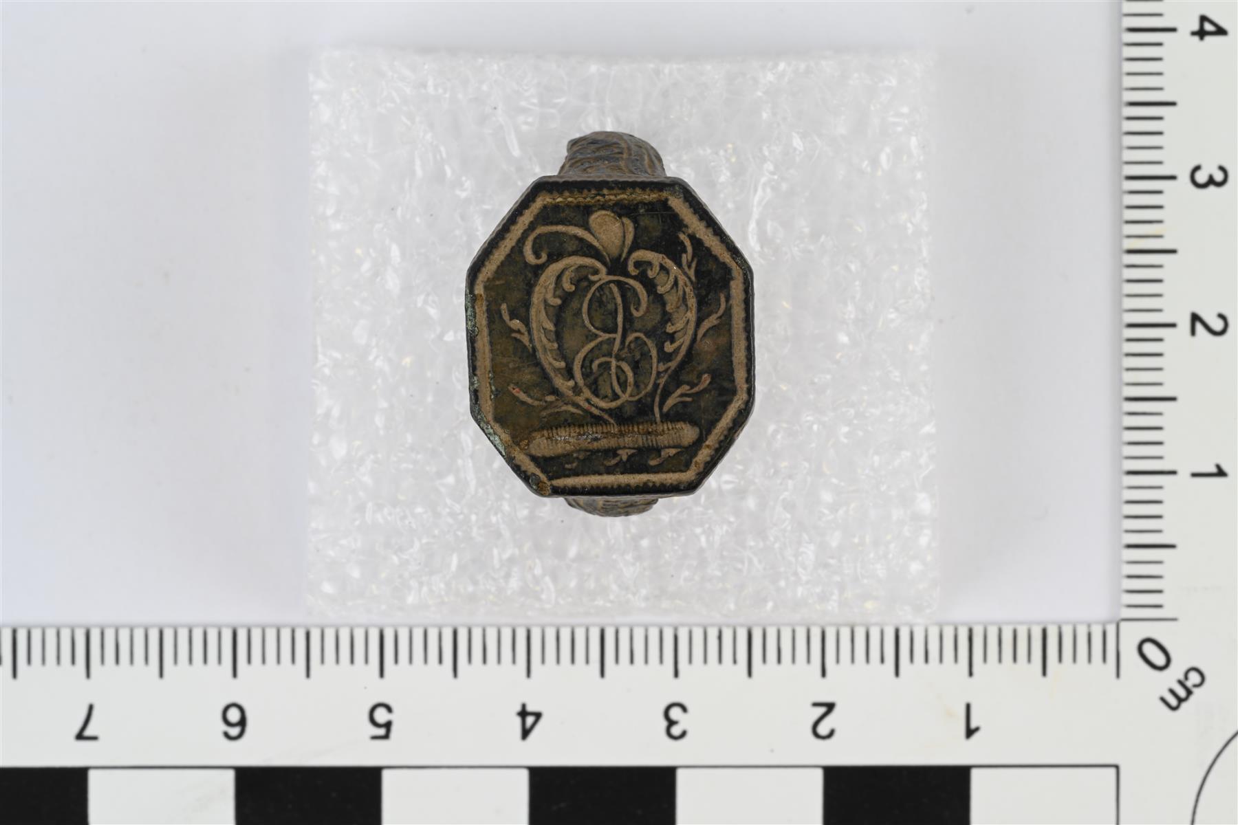 | Sinettisormus. Kahdeksankulmainen kanta, johon on kaiverrettu lehväkuvio ja sen keskelle ilmeisesti B-kirjain. Kuvio on kannassa sormuksen kehän suuntaisesti. Kehän sivuissa kannan molemmin puolin lehvämäistä koristelua. Kehän takaosassa kantaa vastapäätä leima, jossa numerot 62 tai 162. | |