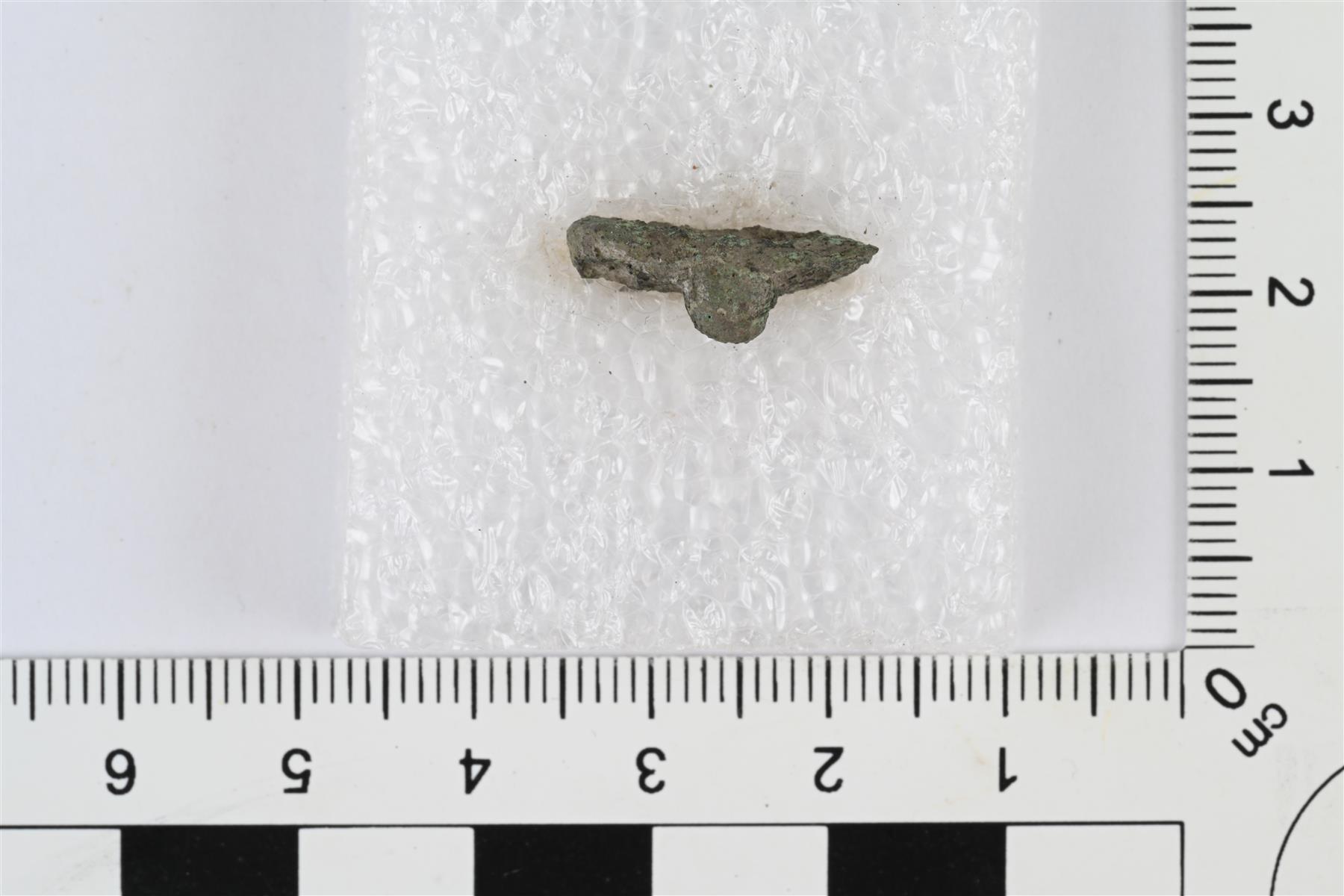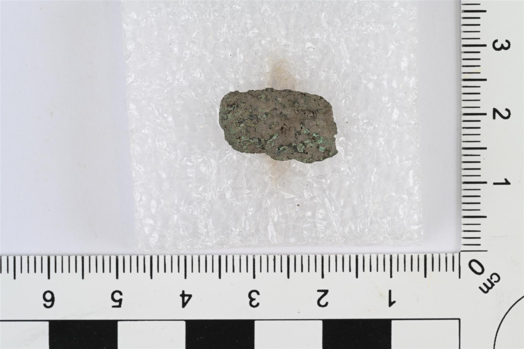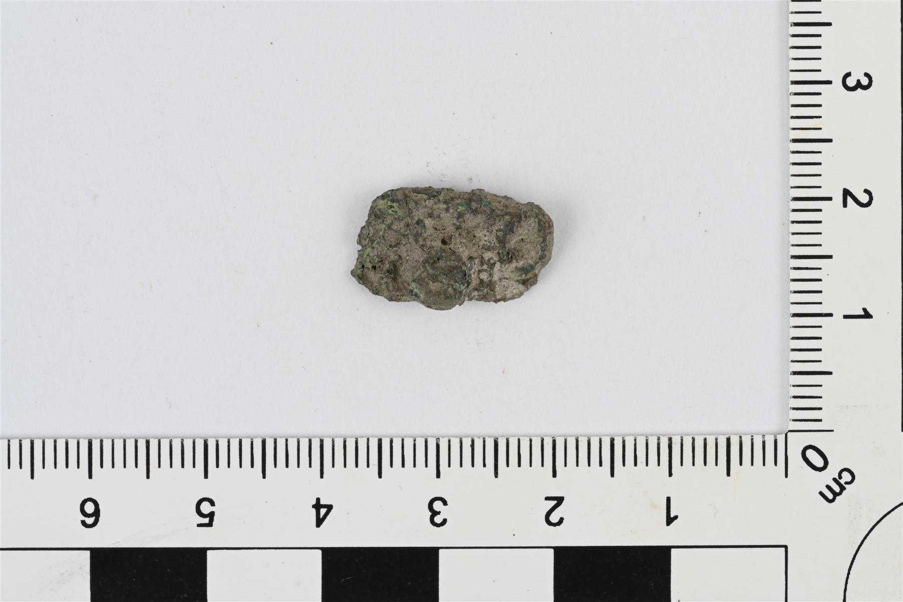 | Mahdollisesti katkelma osittain sulaneesta vyönhelasta. Näyttää neliömäisen helan katkelmalta, taustapuolella tappi. Voi olla myös muuta sulanutta kupariseosta. | |