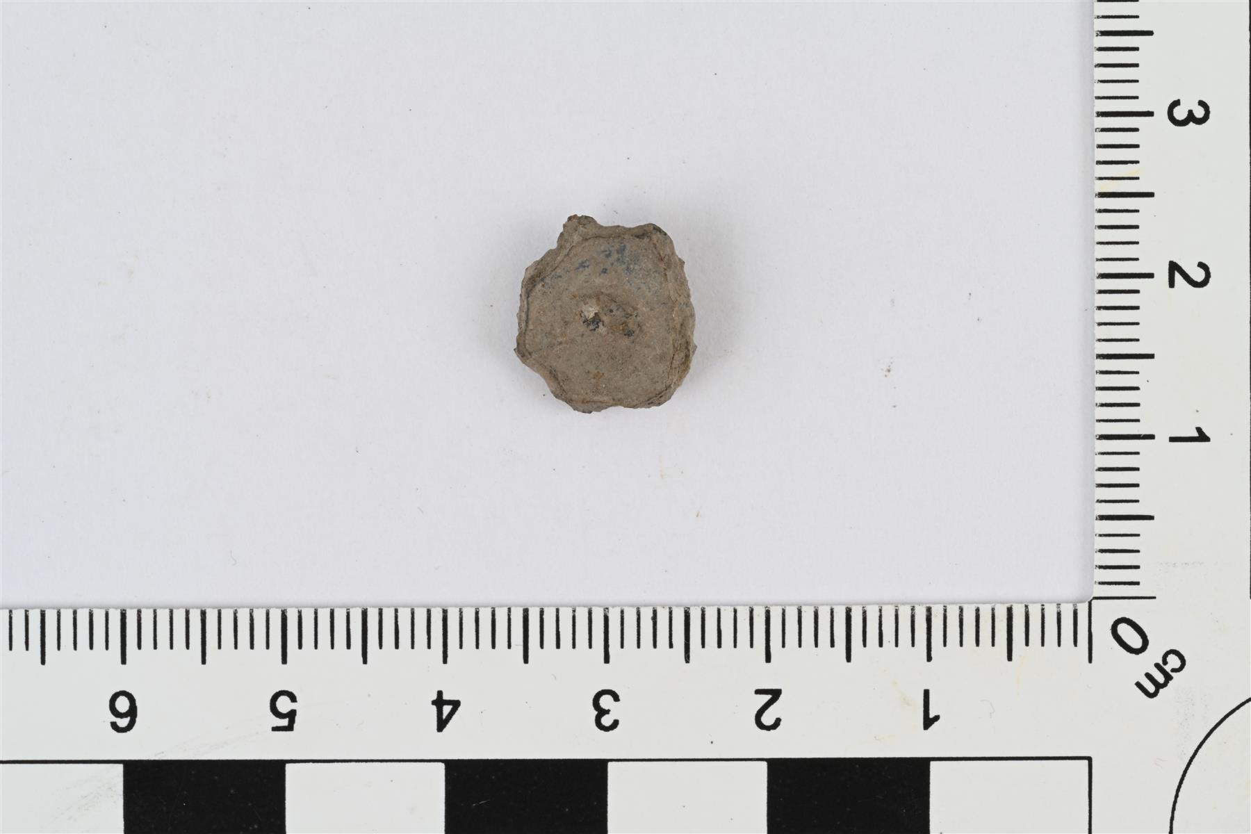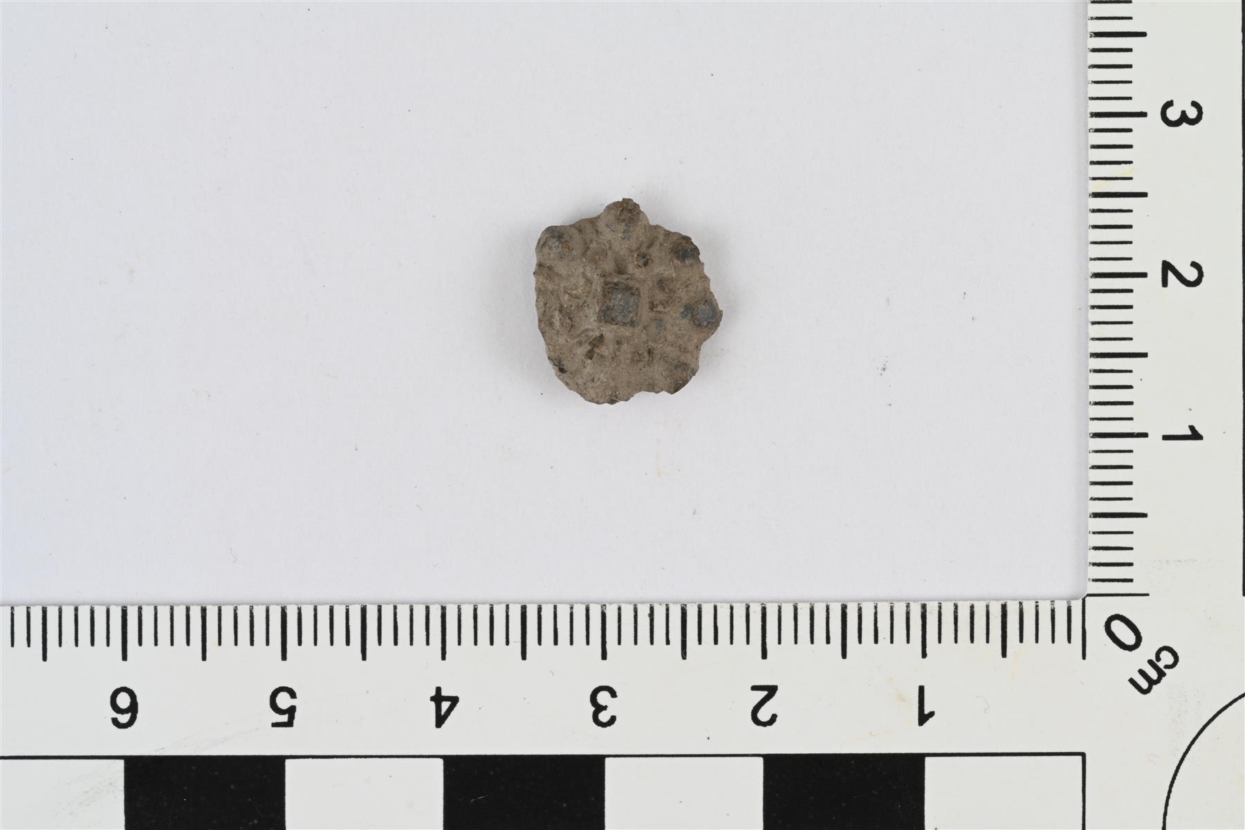 | Hela tai nappi. Luultavasti tinaseosta. Pyöreä litteä kukanmuotoinen esine, jonka taustapuolen keskellä murtumakohta luultavasti kiinnittimen jäljiltä. Etupuolella kukan muotoa mukailevaa reliefikoristelua. Reuna osittain murtunut. | |