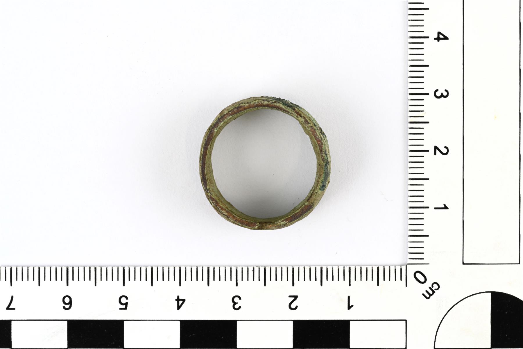 | Tasaleveä umpisormus. Kehässä on koristeluna reunan suuntaisia uurteita. Juotossauma on selkeästi nähtävissä. | |