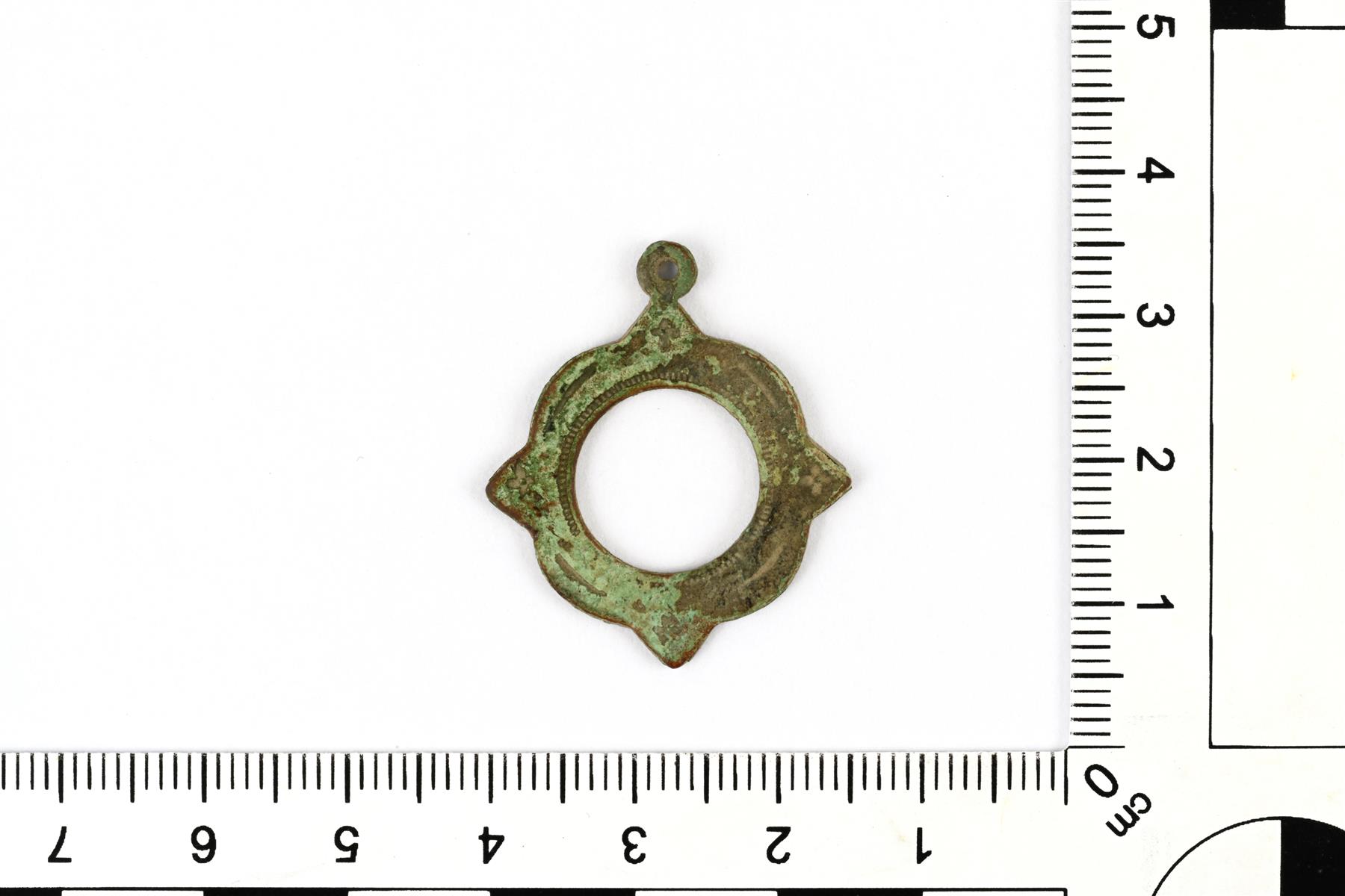 | Pyöreä riipus, jonka reunaa koristaa neljä kolmiomaista ulkonemaa. Keskellä on pyöreä reikä. | |