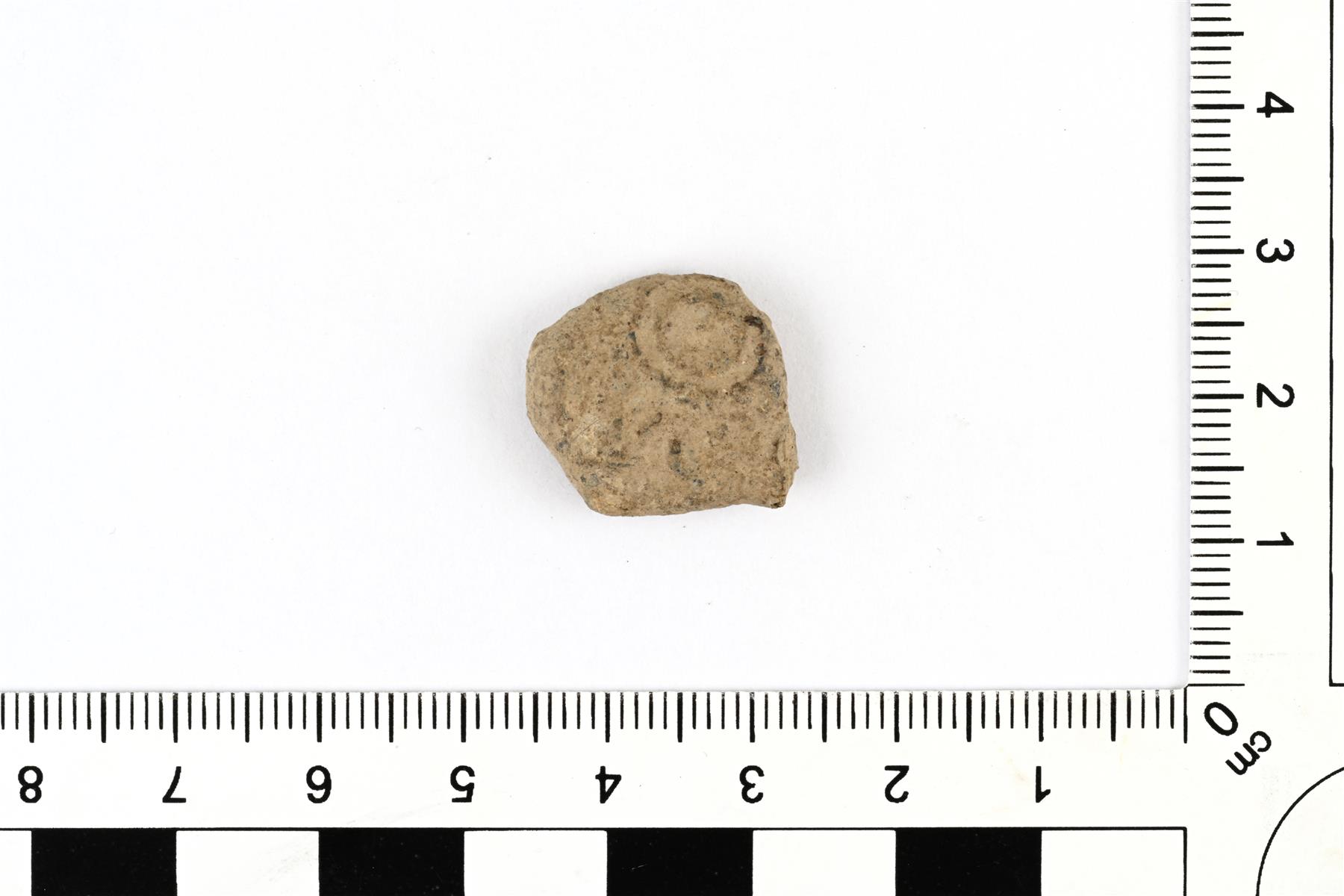 | Tunnistamattoman kupariseosesineen katkelma. Pinnassa on ympyräkoriste. | |