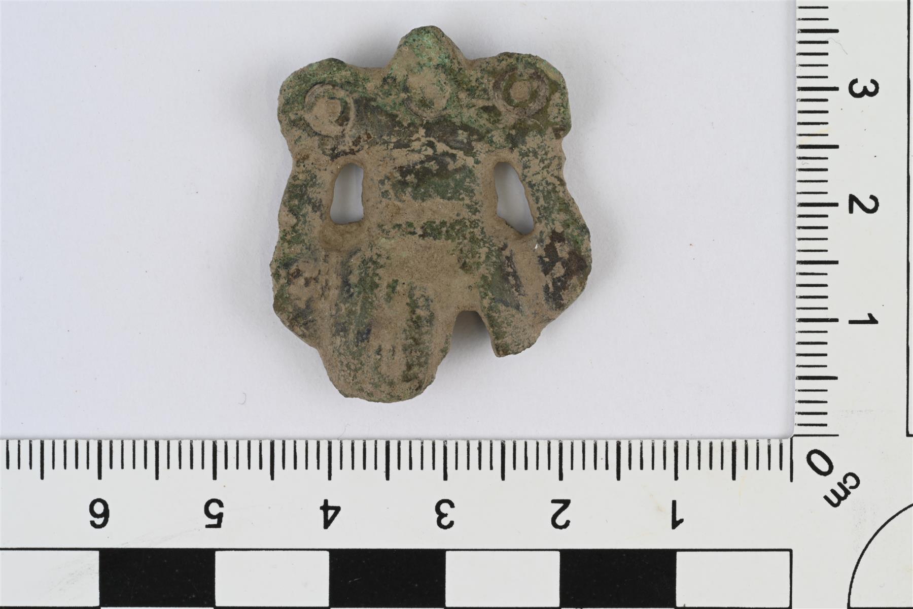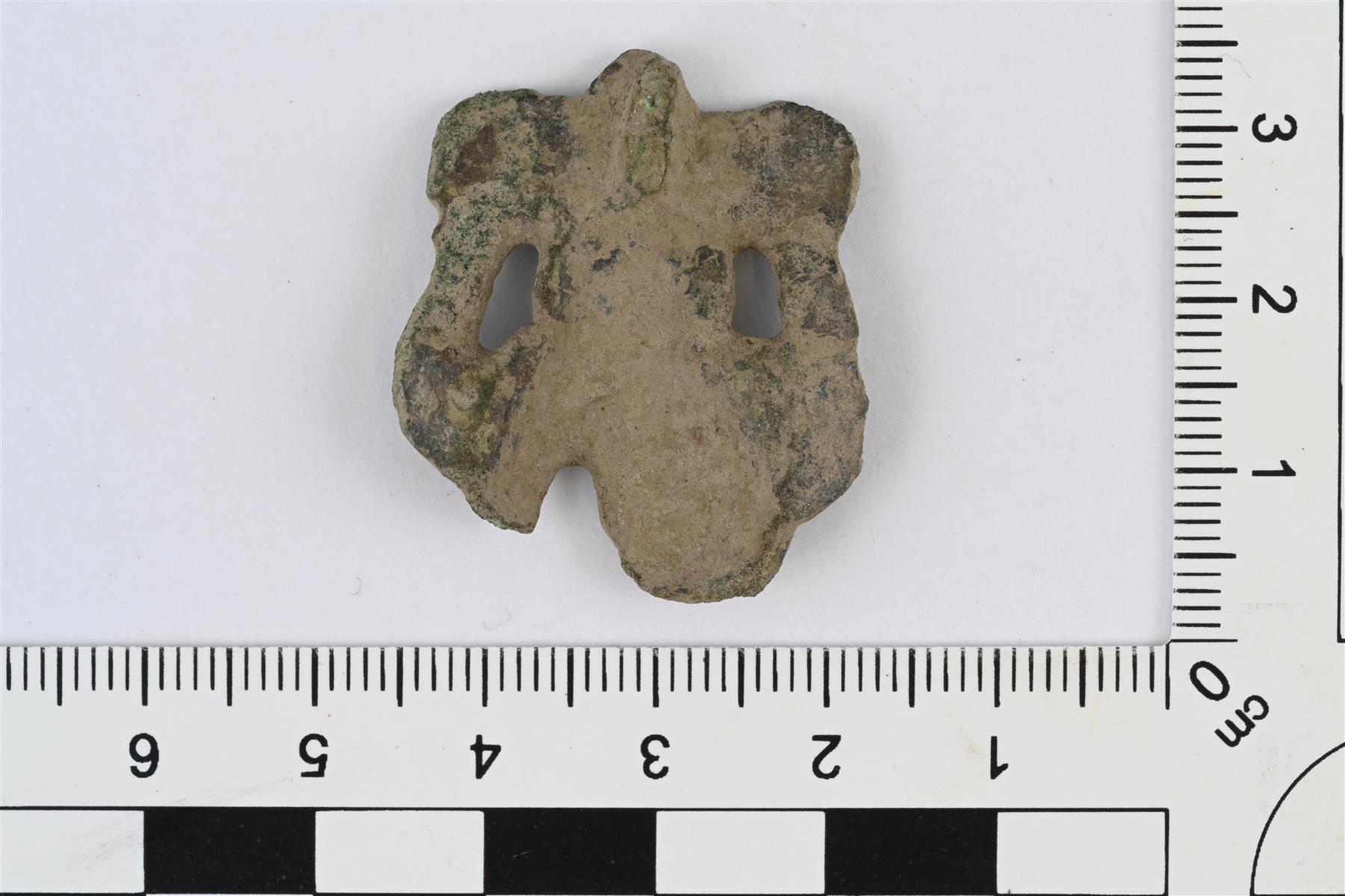| Rapusoljen katkelma, soljen etupäästä. Etureunassa rivissä kolme häränsilmäleimaa. Kaari on taustapuolelta koverrettu. Taustapuolella jäänne neulakodasta. | |