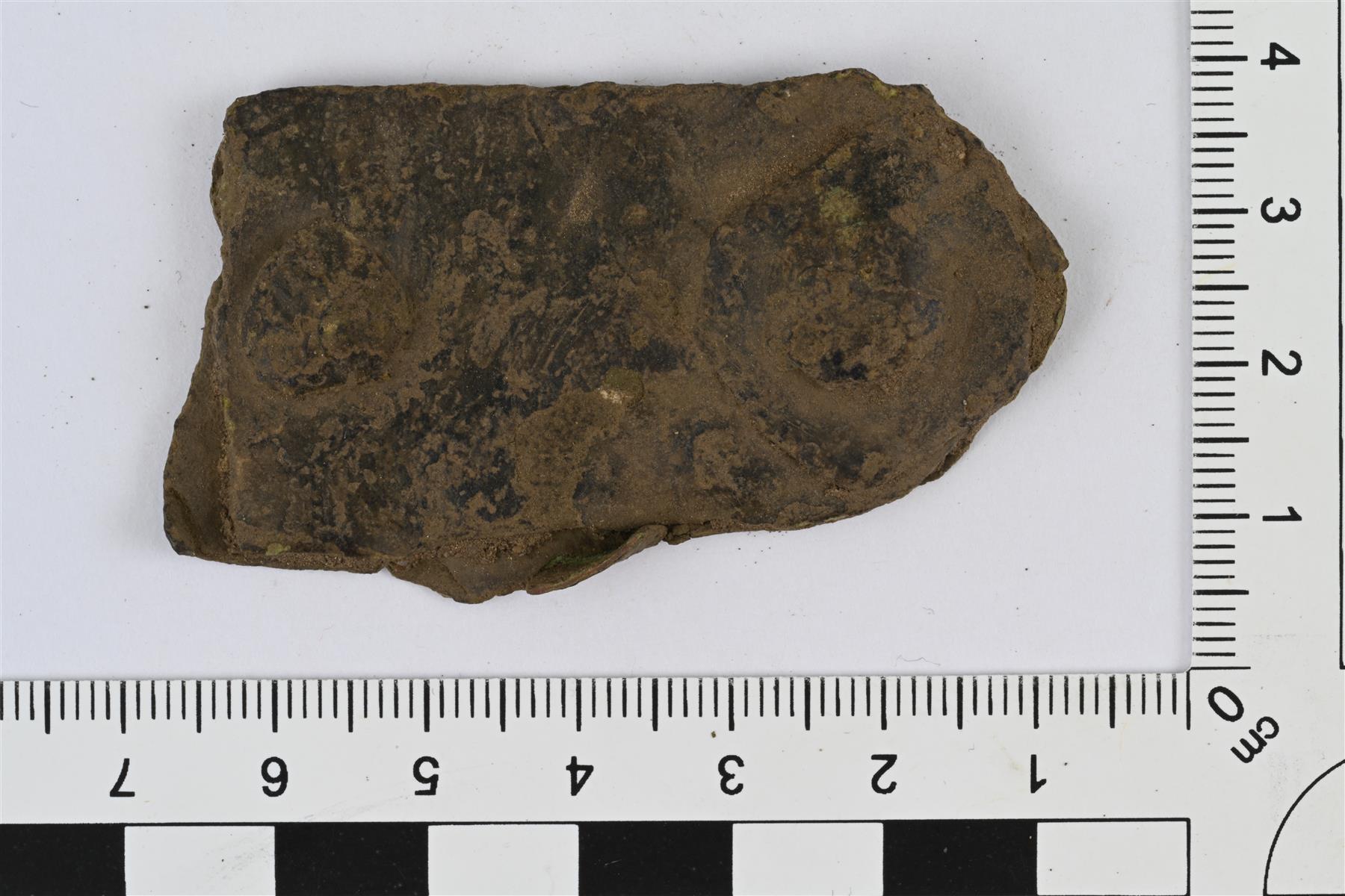| Niitattua kupariseoslevyä. Mahdollisesti kattilasta. Kaksi kerrosta levyä, joiden läpi on lyöty kaksi kupariseosniittiä. Toisen niitin kohdalla pala vielä kolmannesta levykerroksesta. | |
