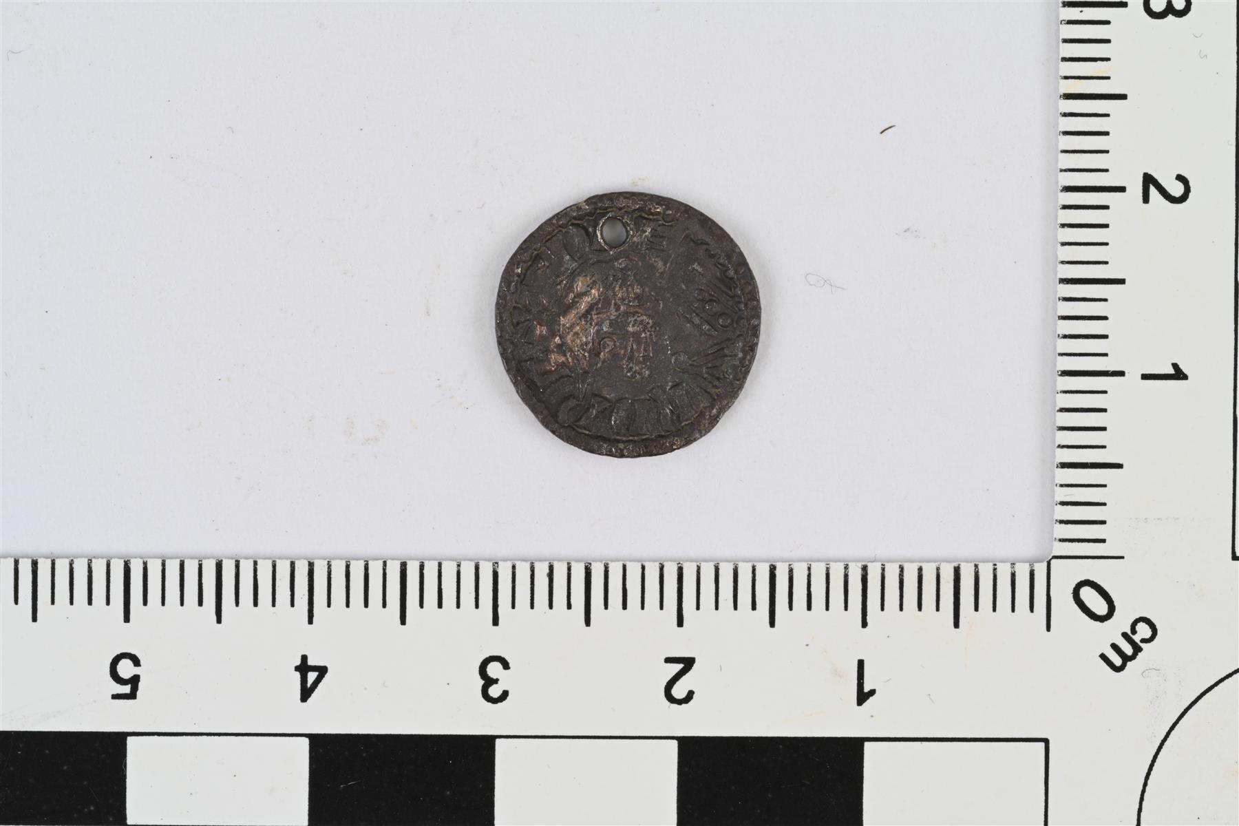 | Edvard Tunnustaja, penninki small flan type, Lontoo 1048–1050 (MM Wulfwine). Rei’itetty. Tunnistus Frida Ehrnsten, Kansallismuseon rahakammio. | |