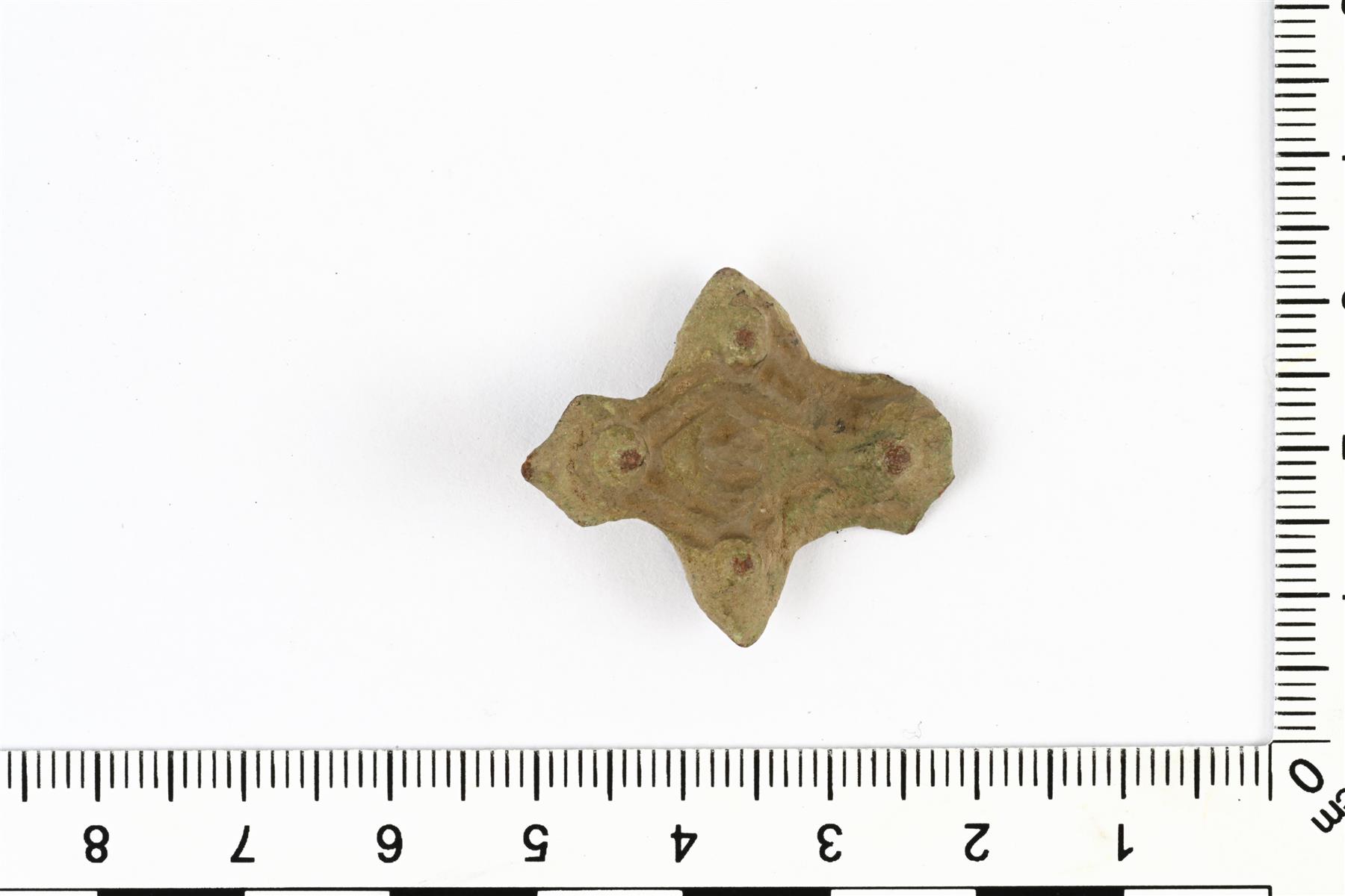| Tasavartisen soljen päätykatkelma. Tappikoristeet ovat melko kuluneet. Viivauurrekoristeet muodostavat sisäkkäisiä rombeja. Neulakota on hajonnut. Vrt. Kivikoski Fig. 12. | |