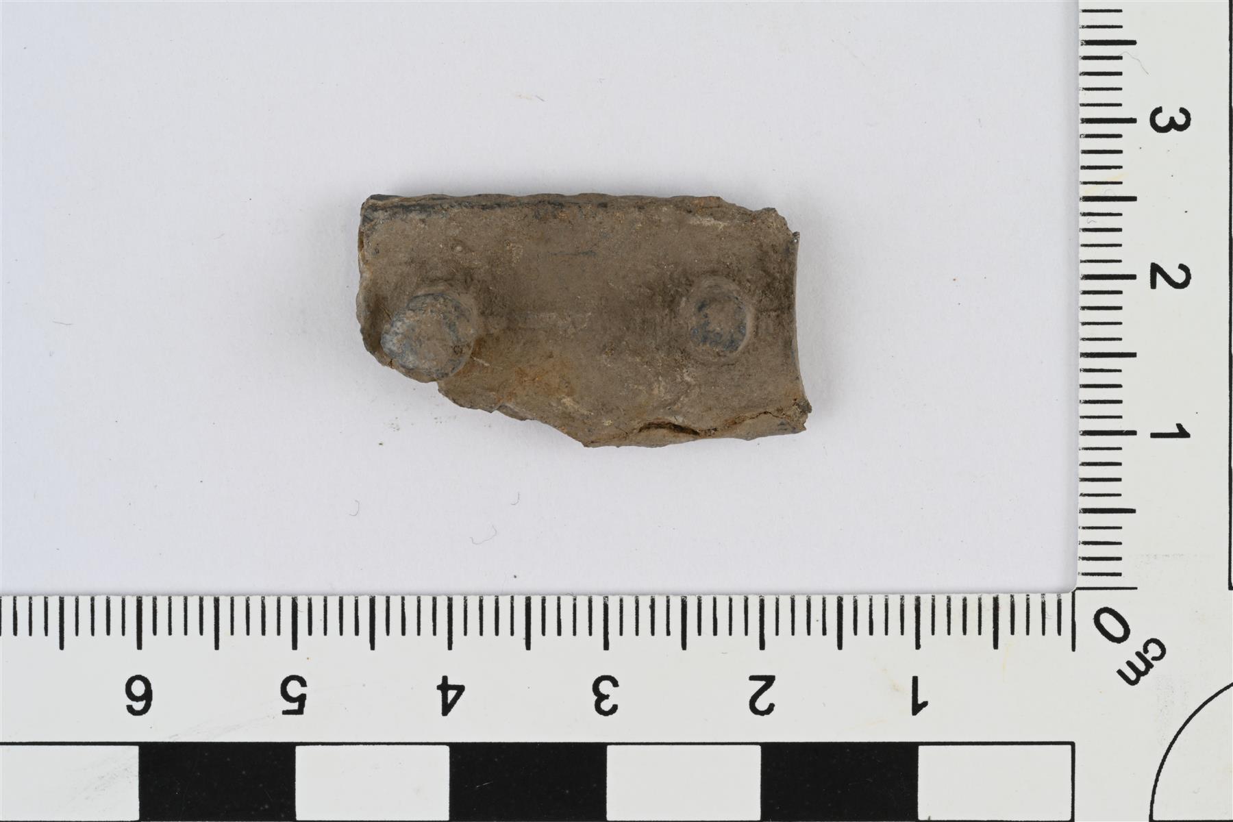 | Vyön tai valjaiden hela. Luultavasti tinaseosta. Suorakulmainen, pitkänomainen. Taustapuolella valusauma ja kaksi kiinnitystappia. Etupuolella reliefikoristelua, jossa pitkissä sivuissa hammastus ja keskellä palmettimaisia kuvioita. Yksi kulma murtunut. | |