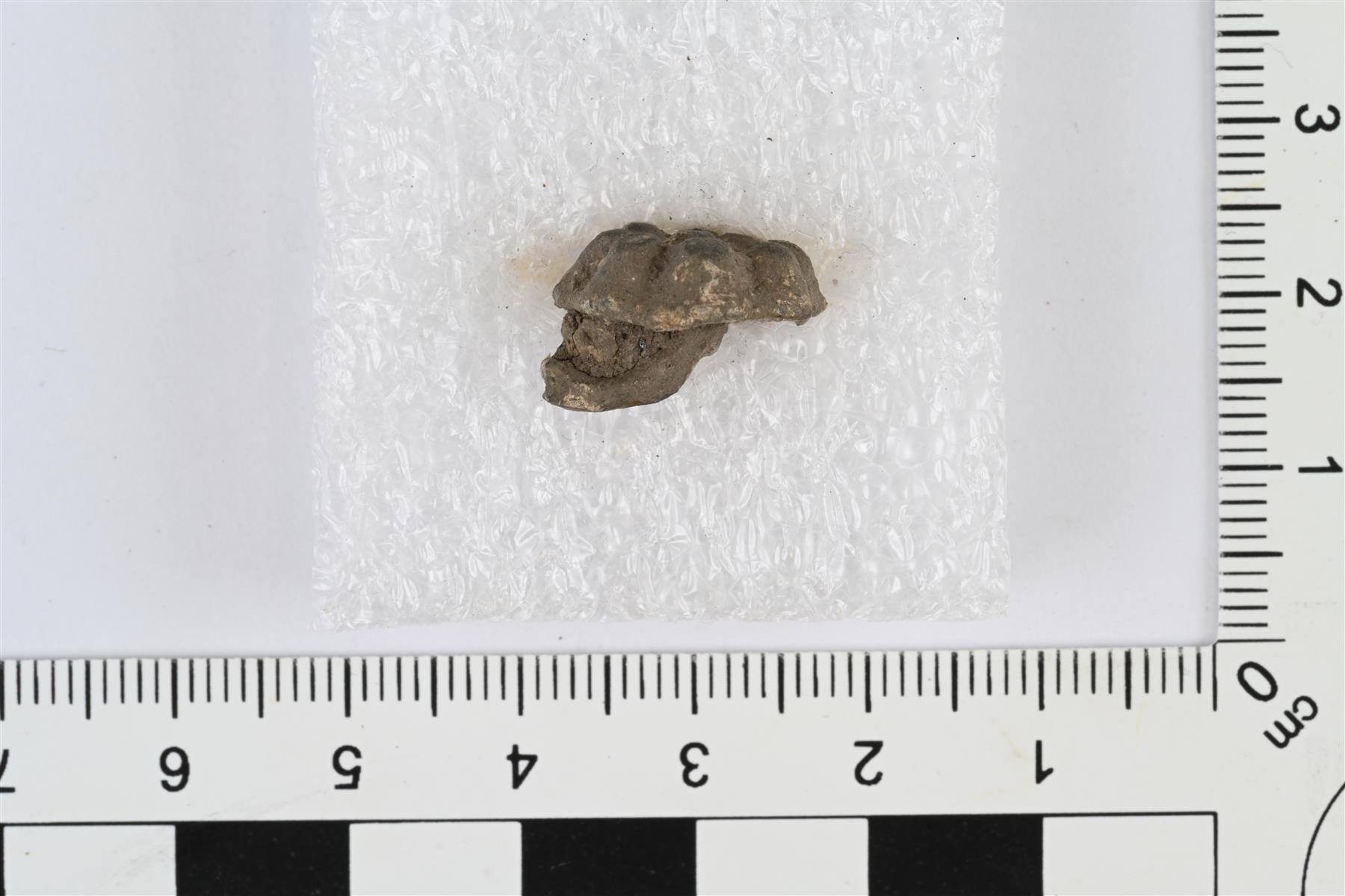| Pieni kukanmuotoinen hela. Luultavasti tinaseosta. Taustapuolella melko pitkä ja vääntynyt kiinnitystappi. | |