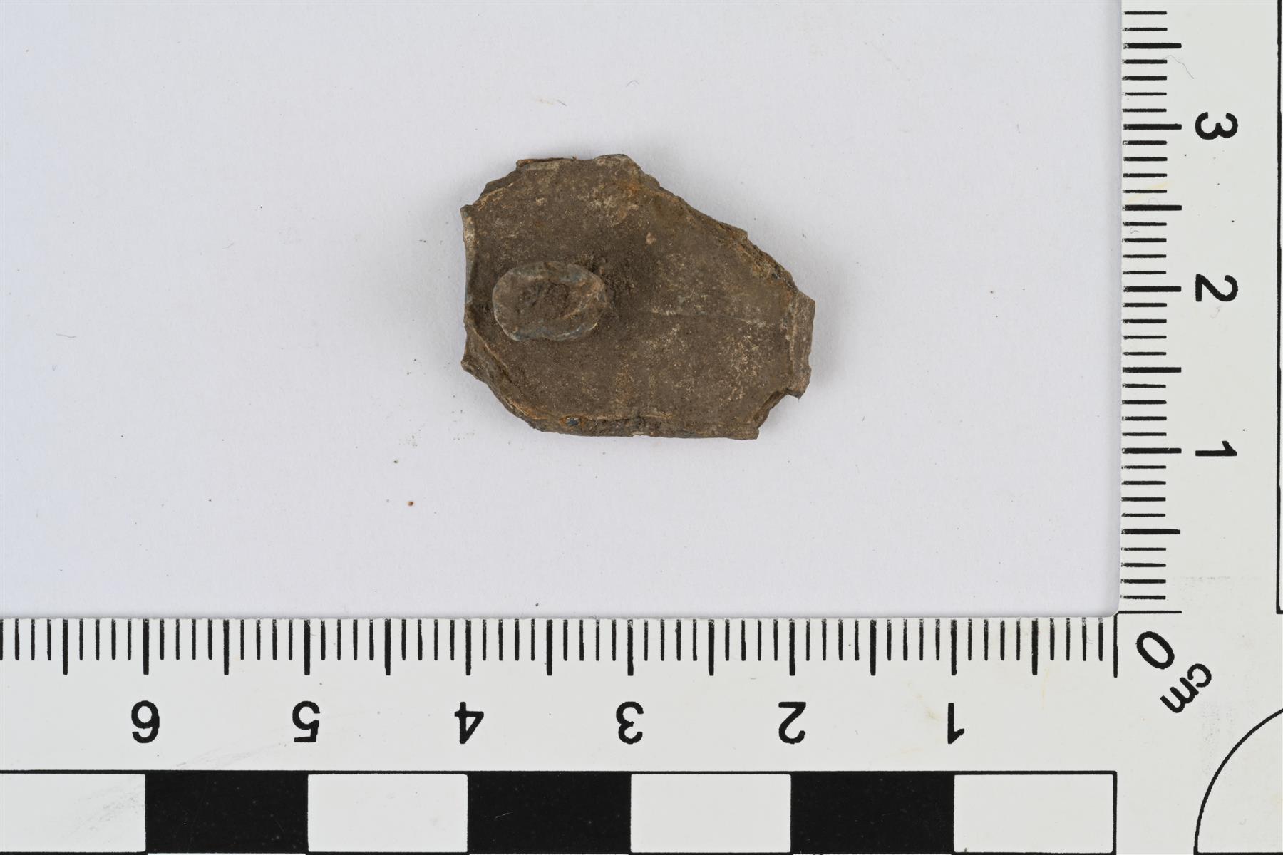 | Vyön tai valjaiden hela. Luultavasti tinaseosta. Suorakulmainen, pitkänomainen. Taustapuolella valusauma ja kiinnitystappi. Reunat murtuneet, mahdollisesti ollut pitempi ja tappeja ollut kaksi. Etupuolella reliefikoristelua, jossa pitkissä sivuissa hammastus ja keskellä viiva- ja pistekuvioita. | |