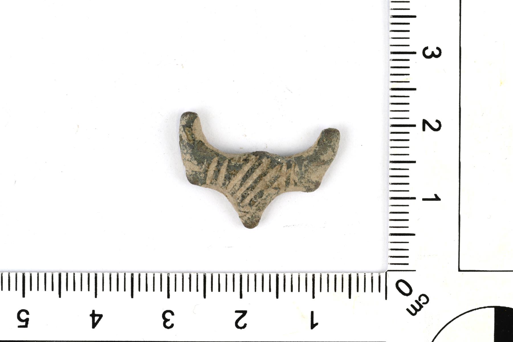 | Vyönsoljen kehän katkelma. Alkuperäiseltä muodoltaan neliömäinen tai suorakaide. Etuosassa on kolmiomainen ulkonema. Koristeluna vinoviivoja. | |