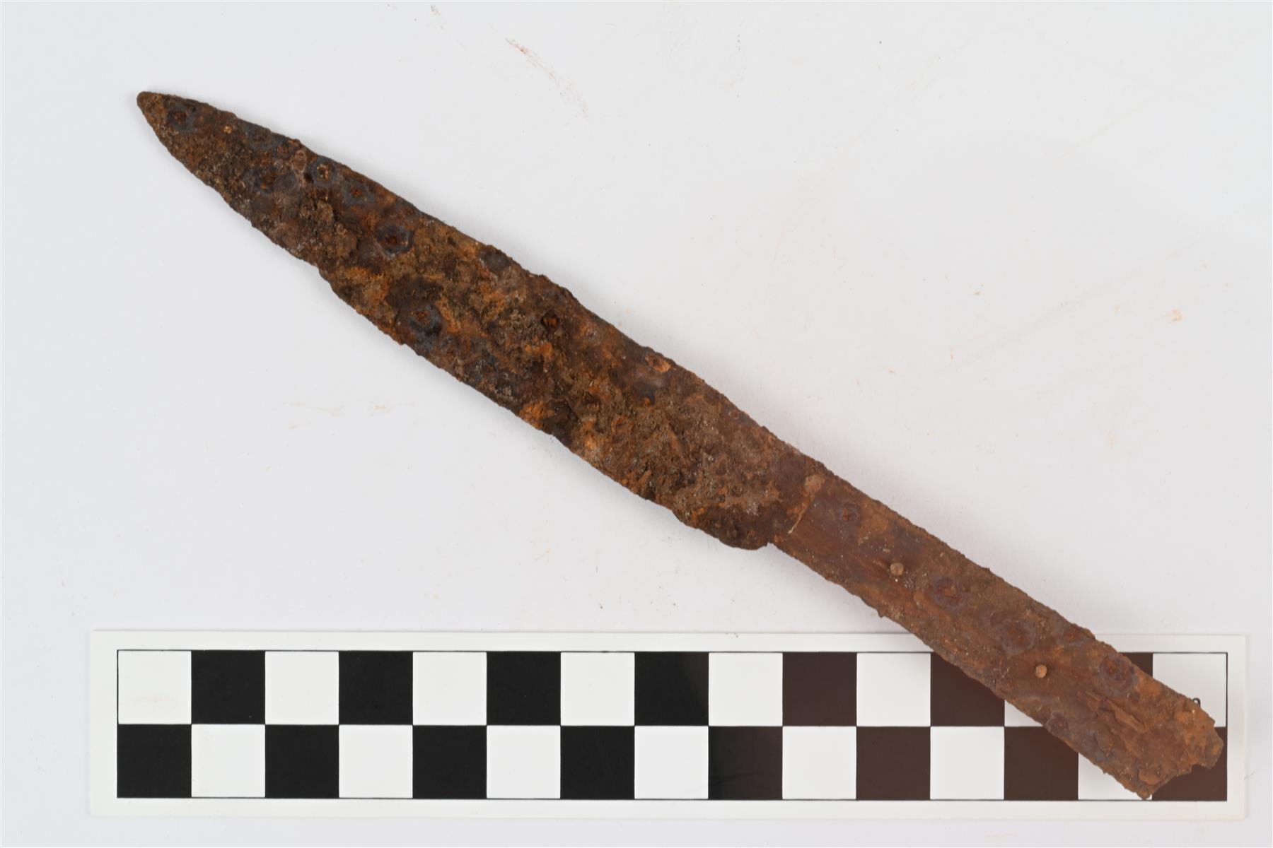 | Kaarevahamarainen pöytäveitsi ("hedelmäveitsi"), jonka leveän ruodon toisella lappeella on jäljellä osa luisesta kahvahelasta. Hela on kiinnitetty paikoilleen pyöreäkantaisilla kupariseosniiteillä. Ruodon toisella lappeella kahden niitin vartta jäljellä. Ruoto levenee hieman kantaa kohti. Ruodonpää ja veitsen päätehela (ylähela) puuttuvat. | |