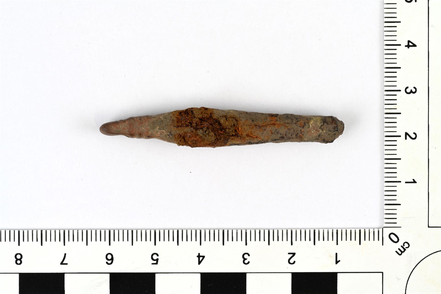 | Koruneulan koristenuppi. Poikkileikkaukseltaan neliömäinen. Yläpäässä on ripustuslenkki ja kaksi poikittaista kohovyötä. Rautaisesta neulasta on jäljellä nupin sisällä oleva osa. | |