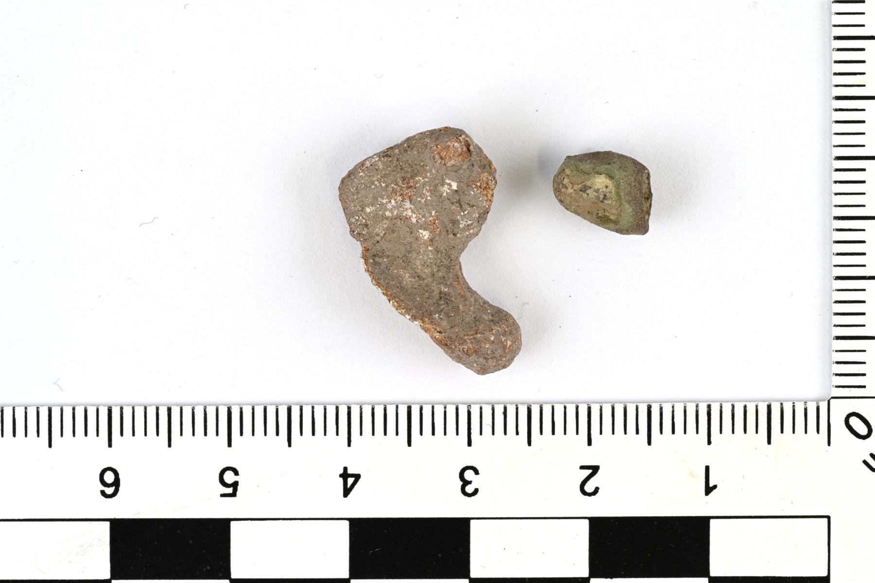 | Kaksi pientä sulaneen kupariseoksen palaa. | |