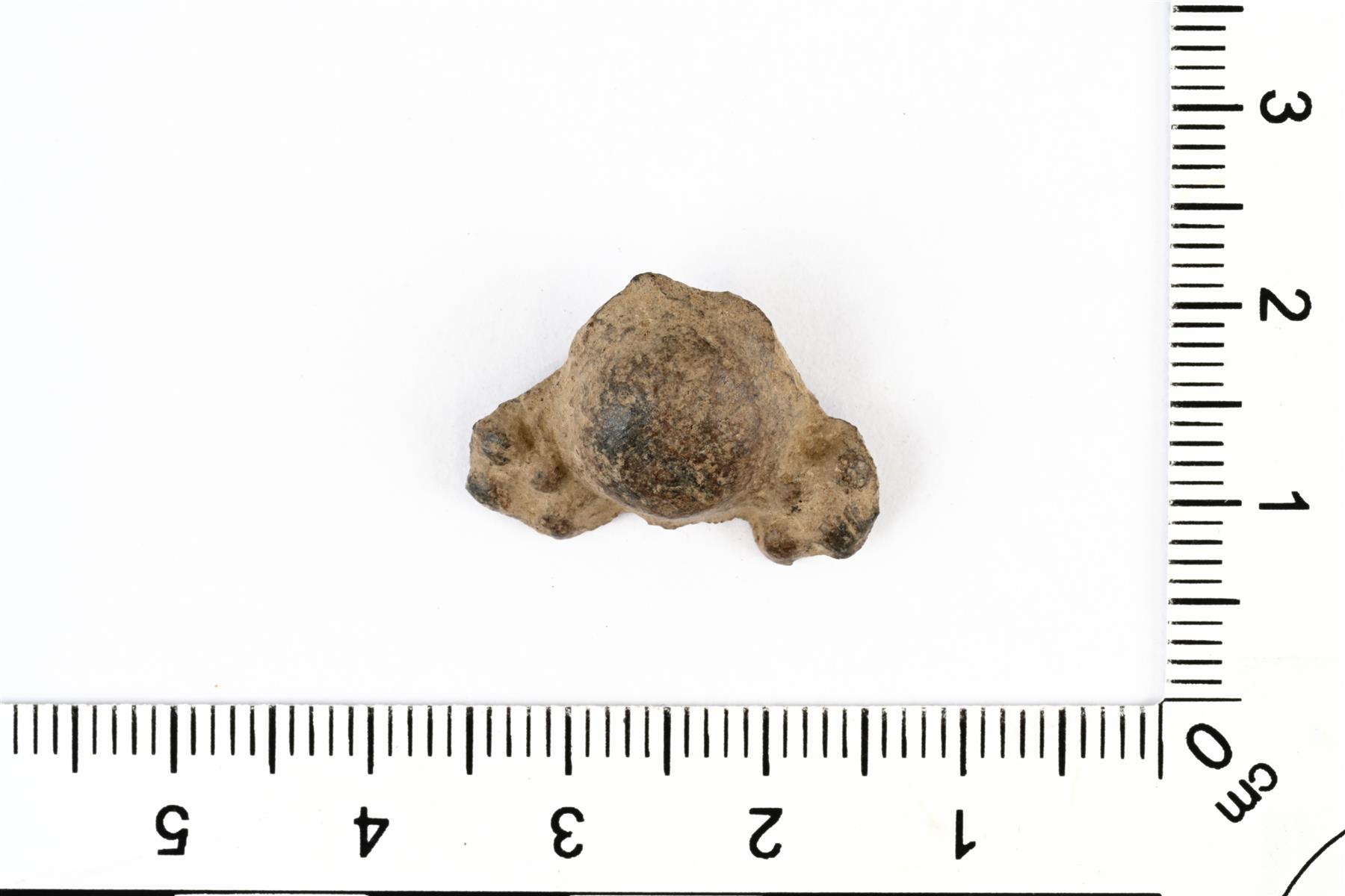 | Puolipallomainen hela, jonka sivuilla on ulkonemat. Näissä on koristeena neljä pienempää kohopistettä. Taustapuolen kiinnitysniitistä on jäljellä palanen. | |